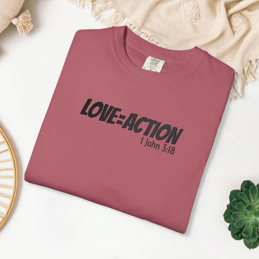 Embroidered Love = Action - 1 John 3:18 Comfort Colors Shirt