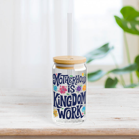 Motherhood is Kingdom Work Sipper Glass with Bamboo Lid & Straw - 16 oz
