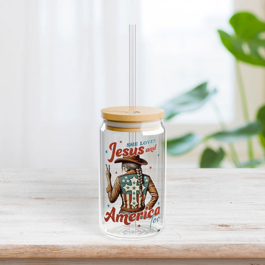 She Loves Jesus and America Too Sipper Glass with Bamboo Lid & Straw - 16 oz