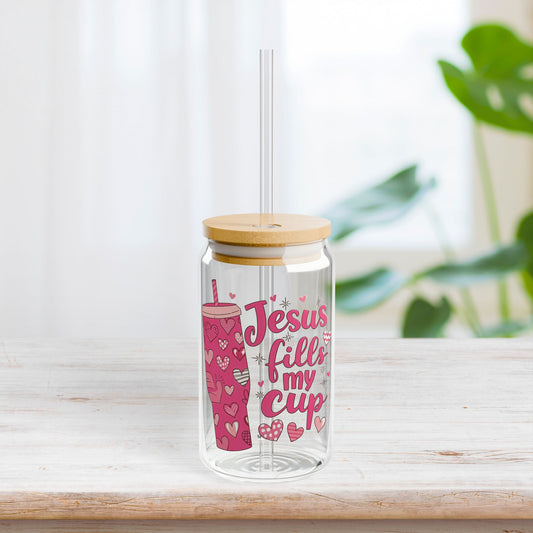 Jesus Fills My Cup Sipper Glass with Bamboo Lid & Straw - 16 oz