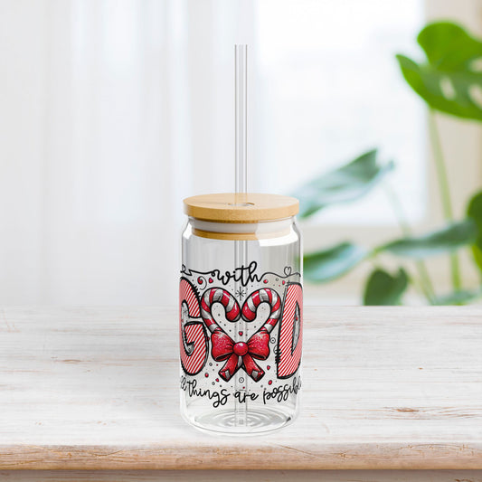 With God All Things Are Possible Christmas Sipper Glass with Bamboo Lid & Straw - 16 oz