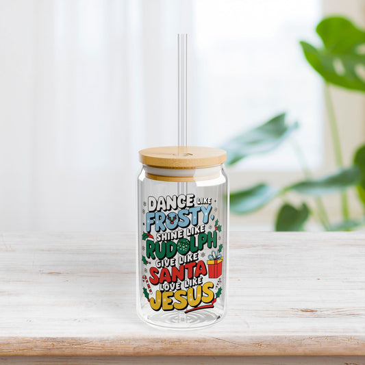 Dance Like Frosty, Shine Like Rudolph, Give Like Santa, Love Like Jesus Sipper Glass with Bamboo Lid & Straw - 16 oz
