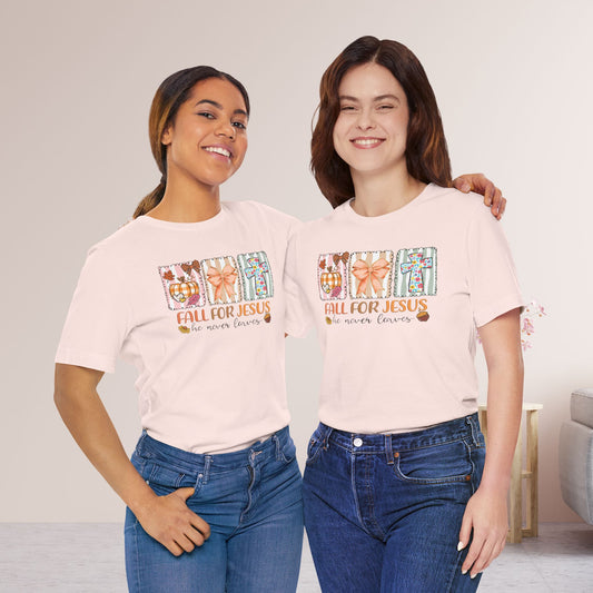 Fall For Jesus He Never Leaves Soft Cotton Tee - Fall Christian Shirt