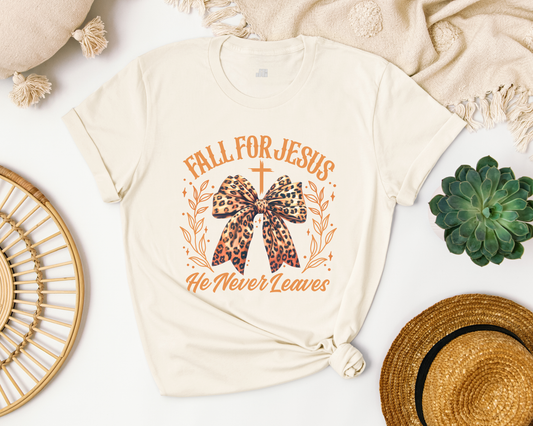 Fall For Jesus He Never Leaves Soft Cotton Tee - Fall Christian Shirt