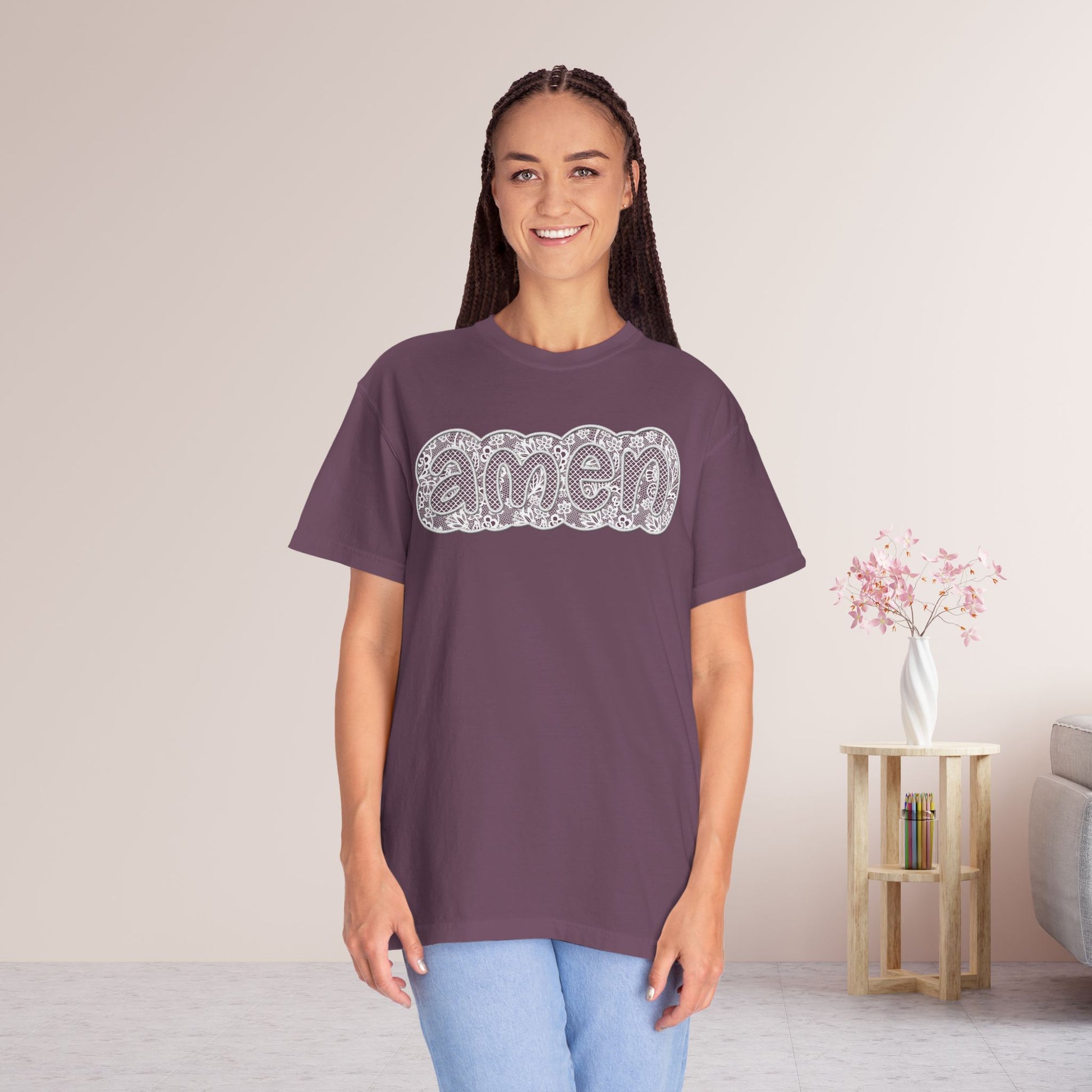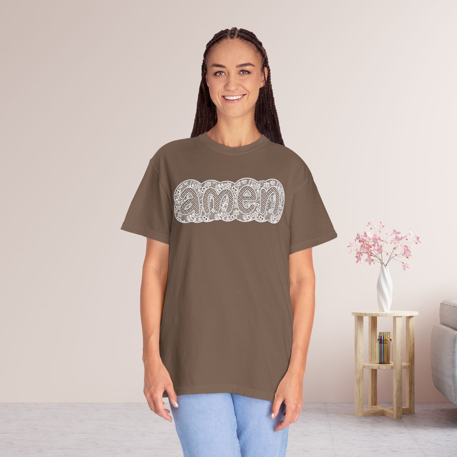 Keep your faith front and center with the Amen Comfort Colors Shirt, a stylish and meaningful piece for your Christian wardrobe. Designed with a beautiful lace-inspired Amen graphic, this tee brings a touch of elegance while declaring a simple but powerful truth.