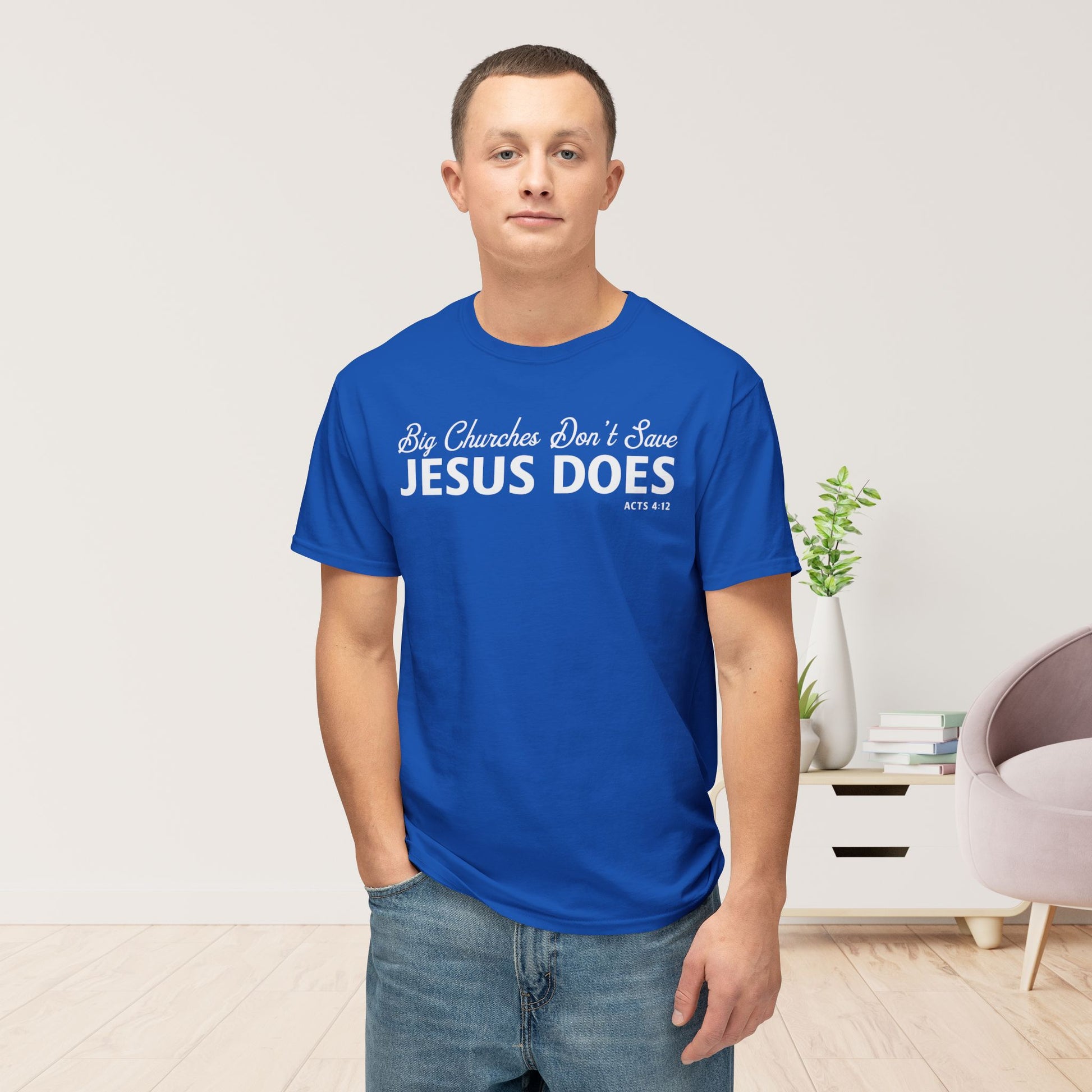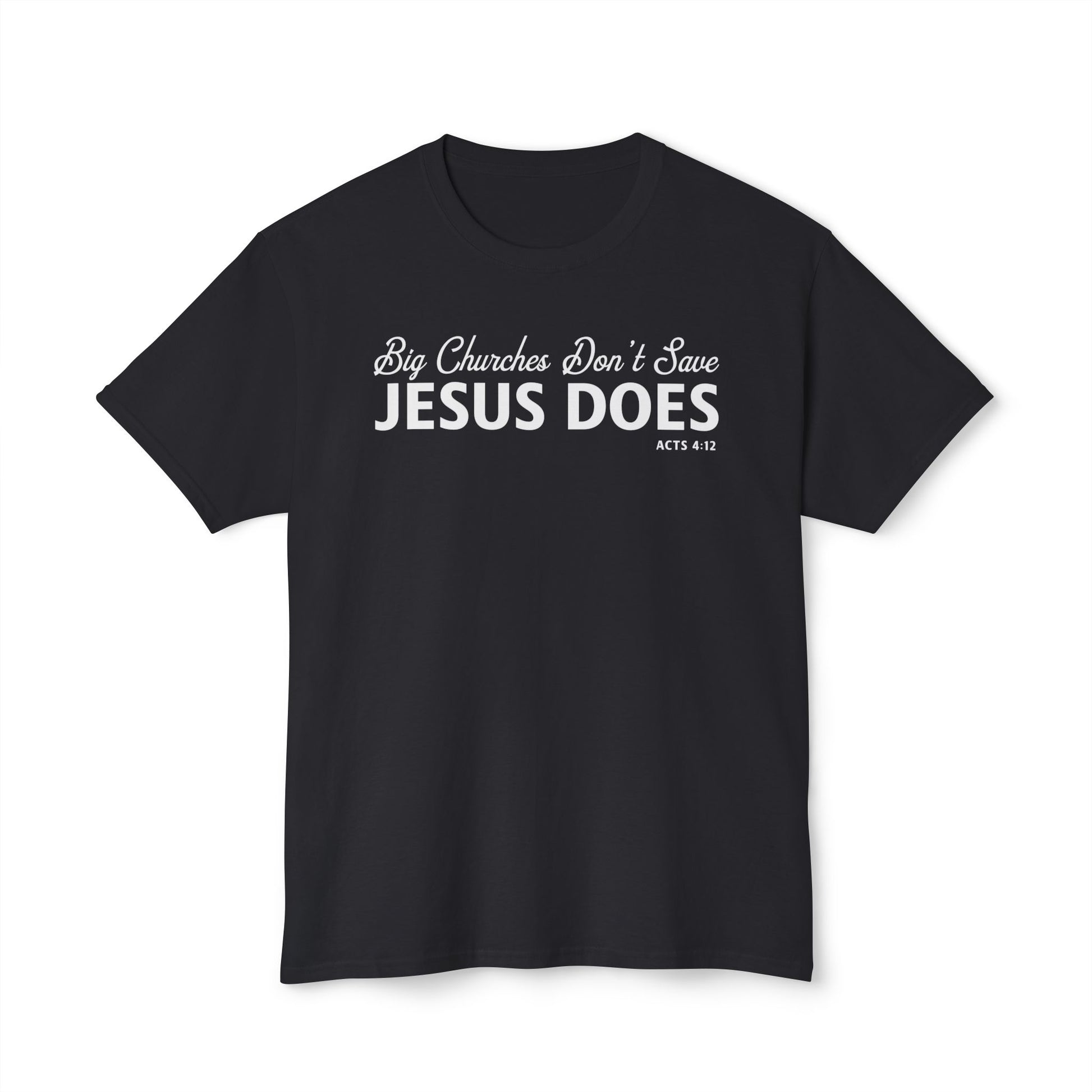 Remind the world of the truth that salvation is not found in a building, a denomination, or a church size—but only in Jesus Christ. Our “Big Churches Don’t Save. Jesus Does” Christian T-Shirt is inspired by Acts 4:12: “Salvation is found in no one else, for there is no other name under heaven given to mankind by which we must be saved.”