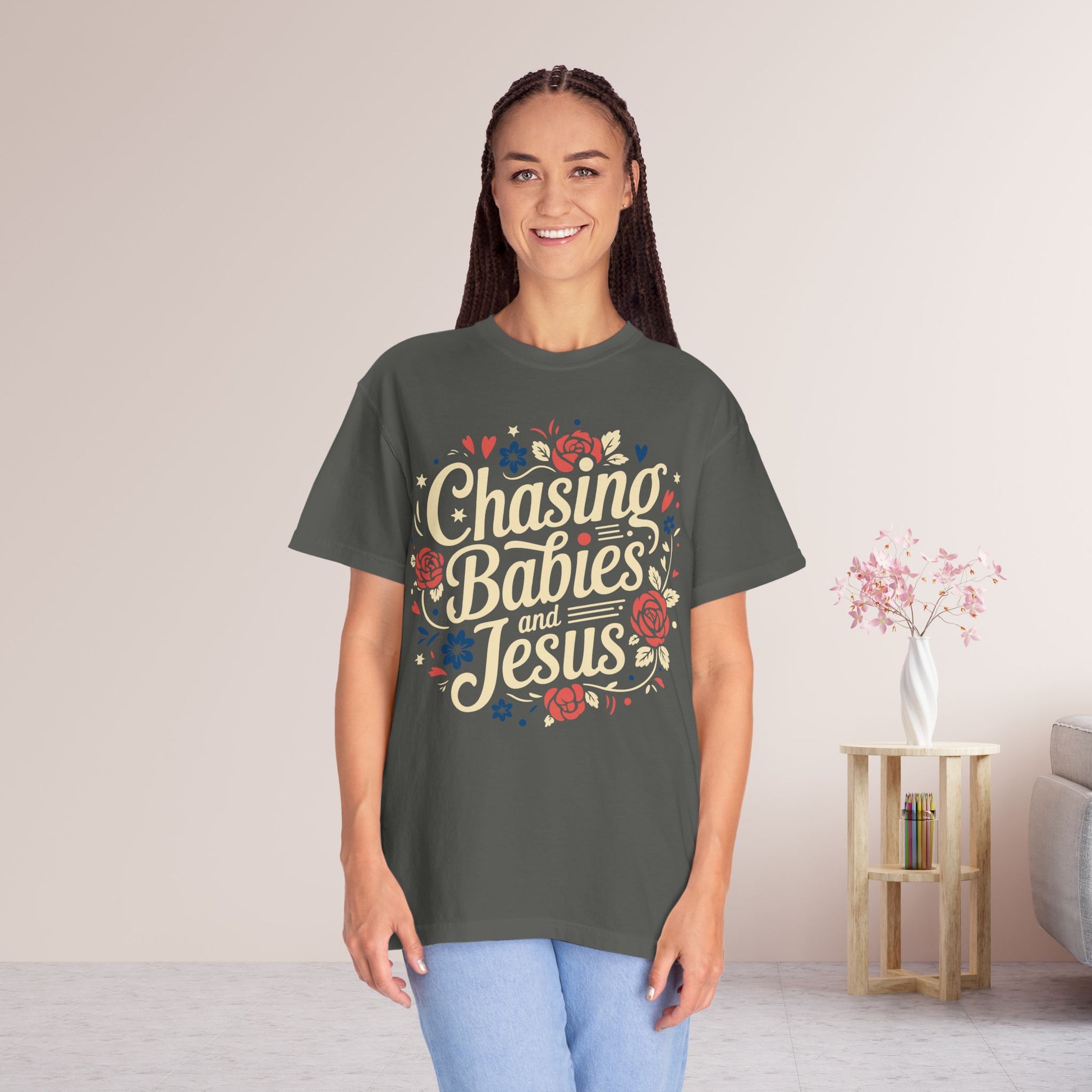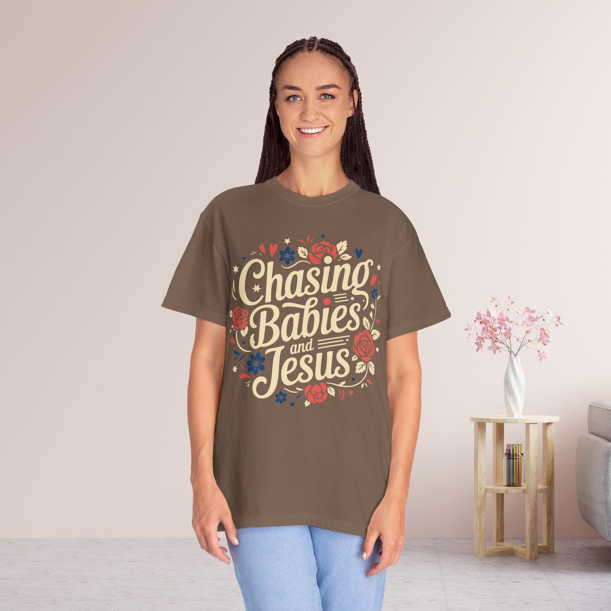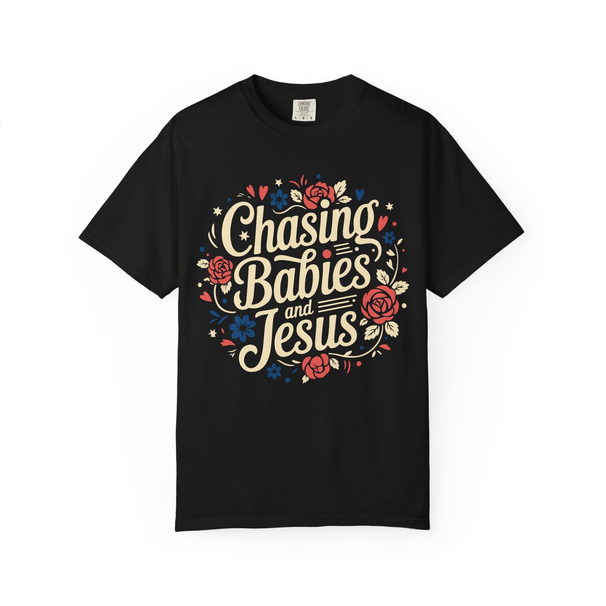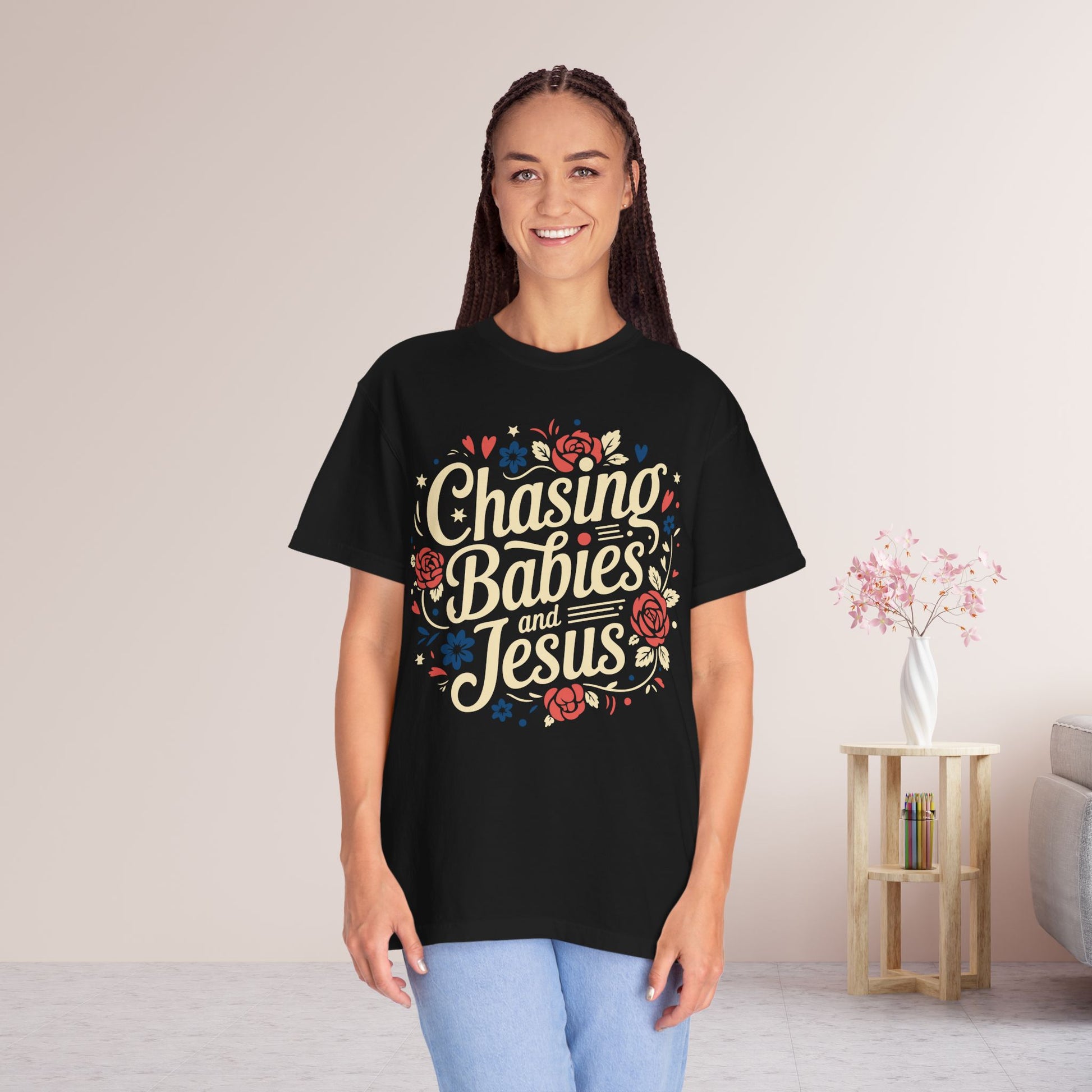 Life’s a beautiful whirlwind when you’re chasing after little feet and chasing after faith. This soft, cozy tee celebrates the joyful chaos of motherhood and the unwavering love found in Jesus.