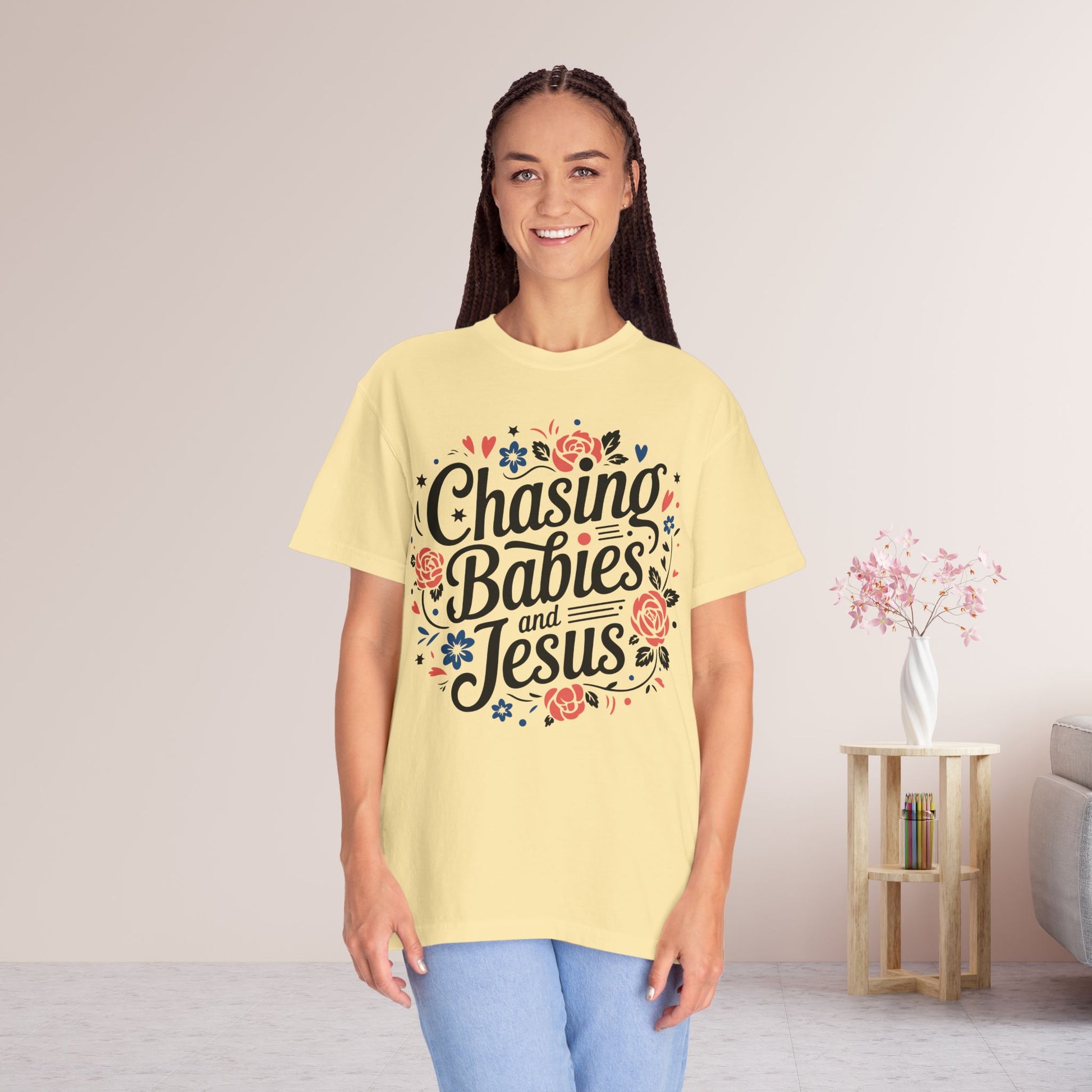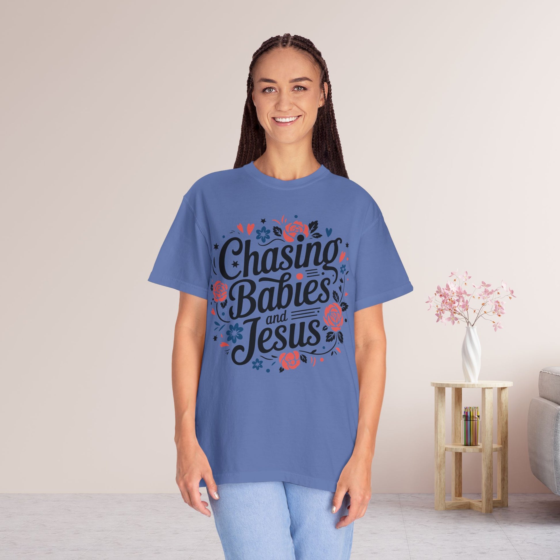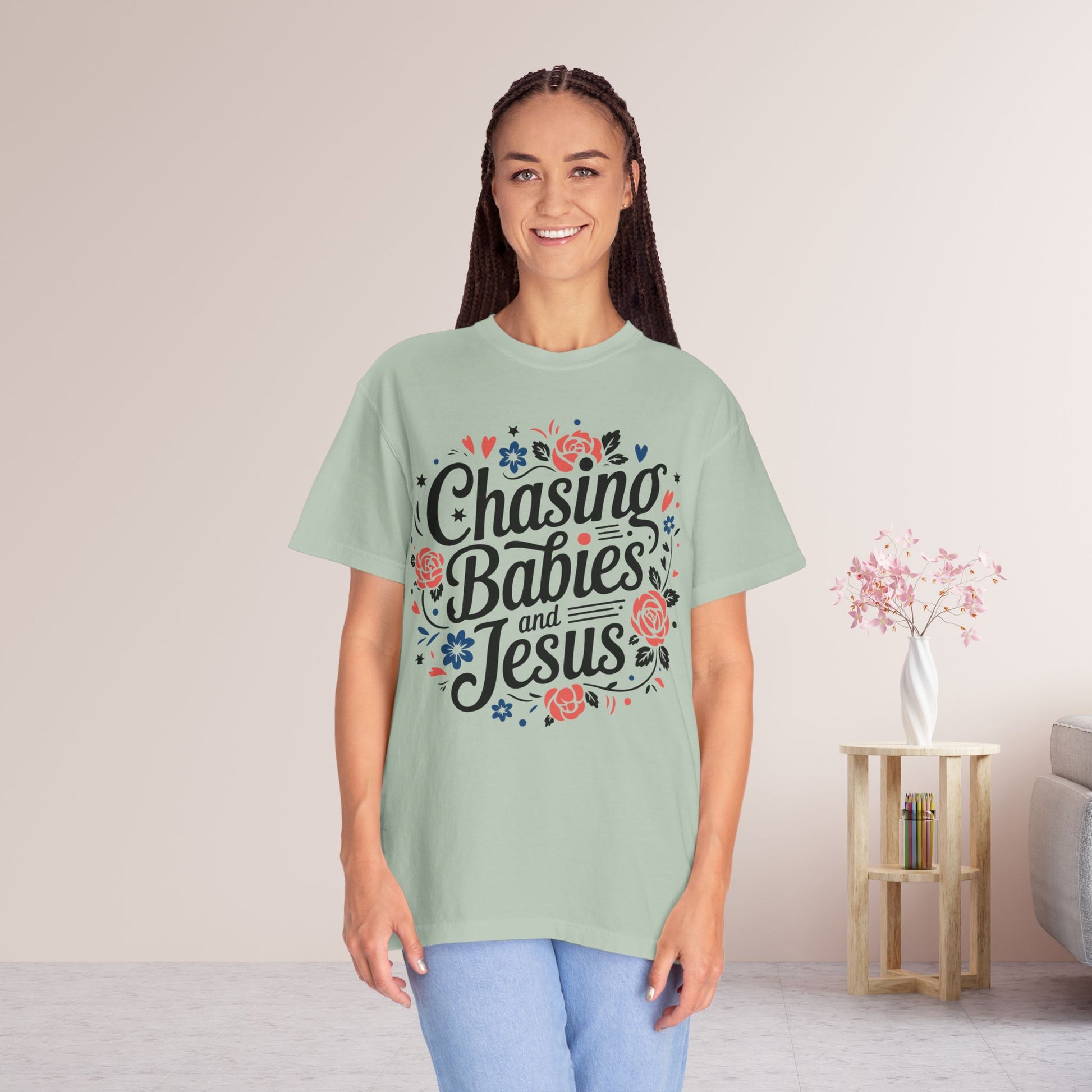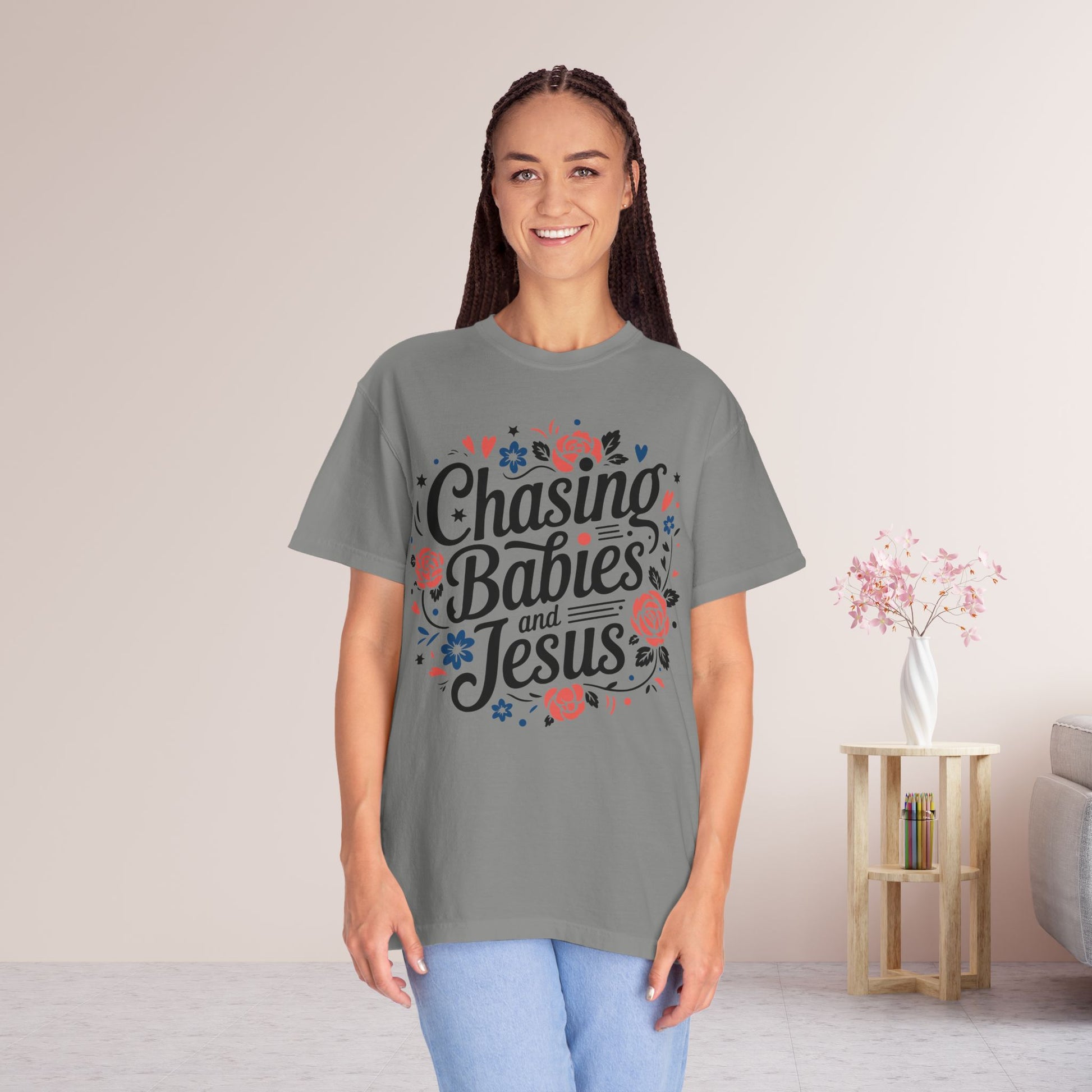 Life’s a beautiful whirlwind when you’re chasing after little feet and chasing after faith. This soft, cozy tee celebrates the joyful chaos of motherhood and the unwavering love found in Jesus.