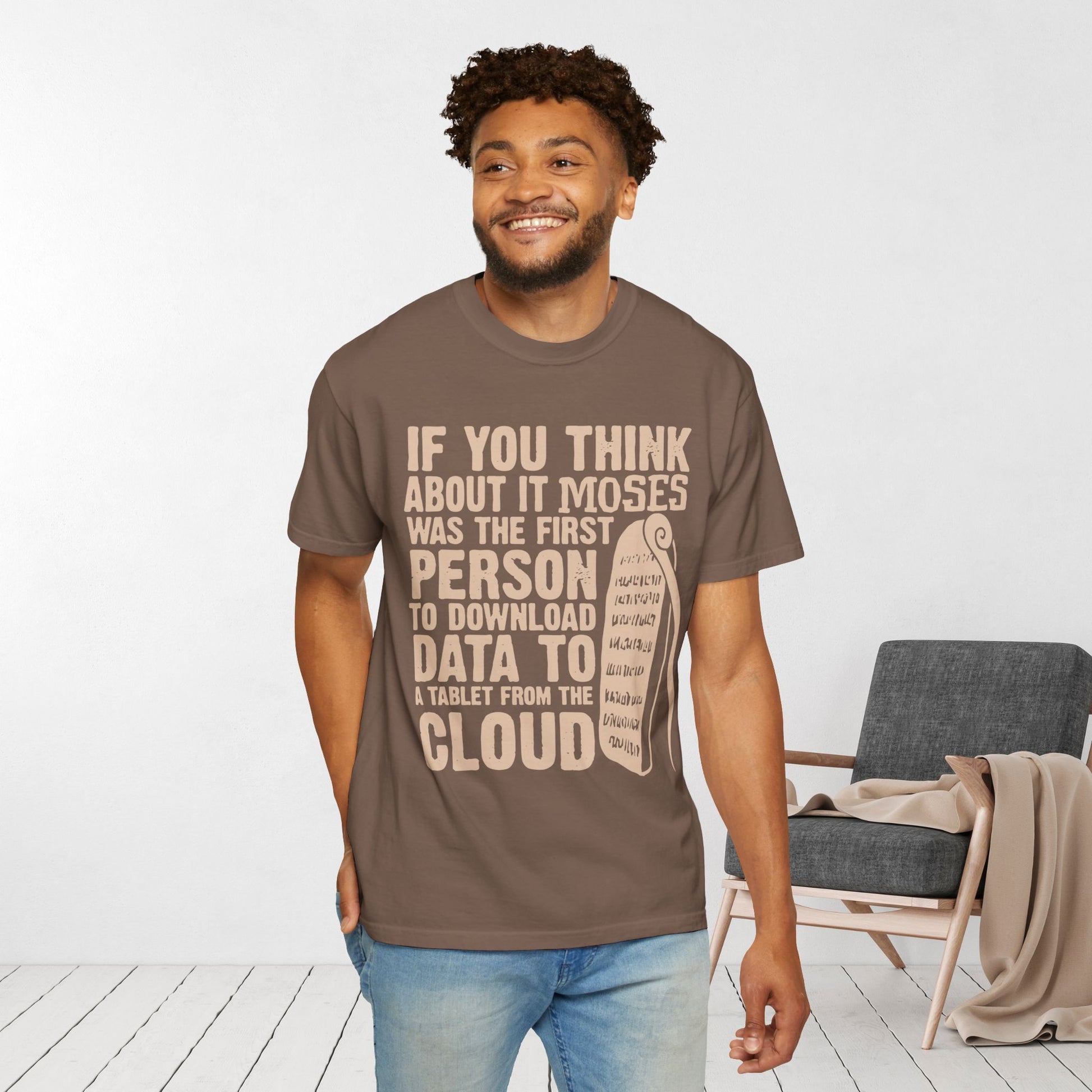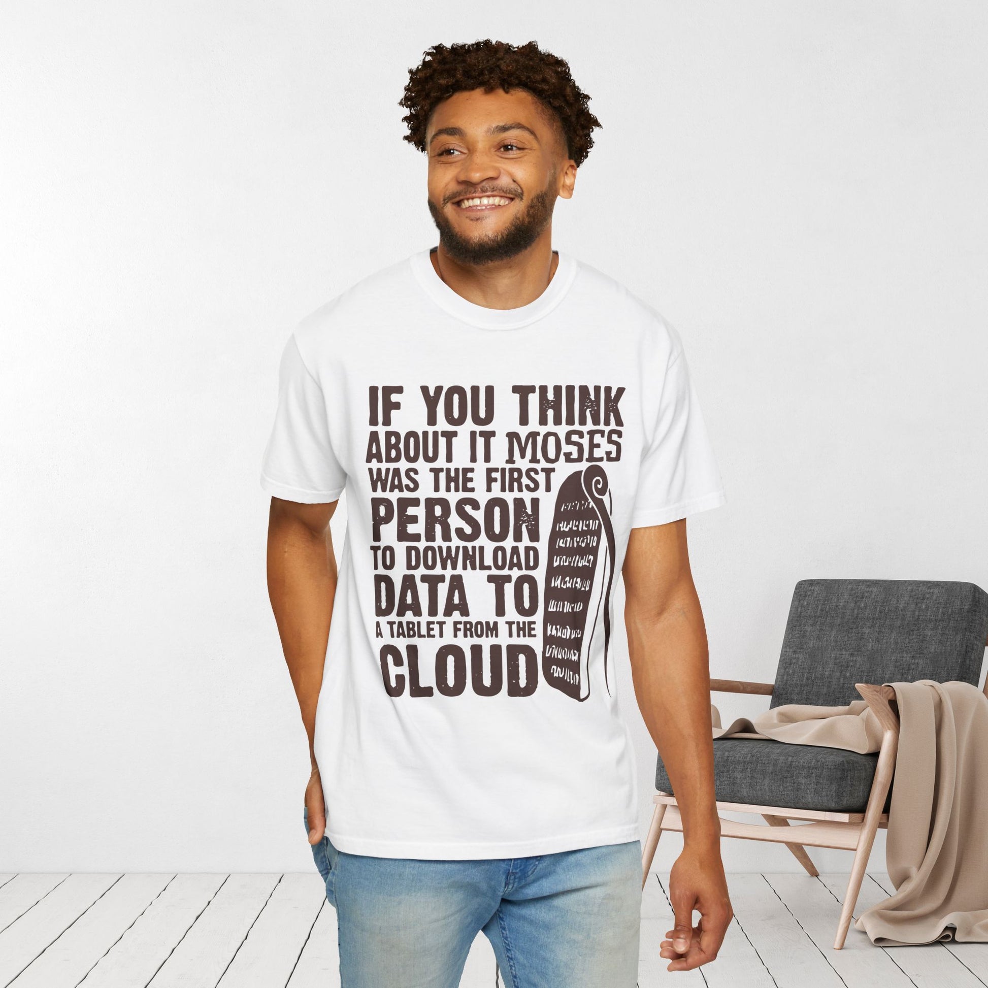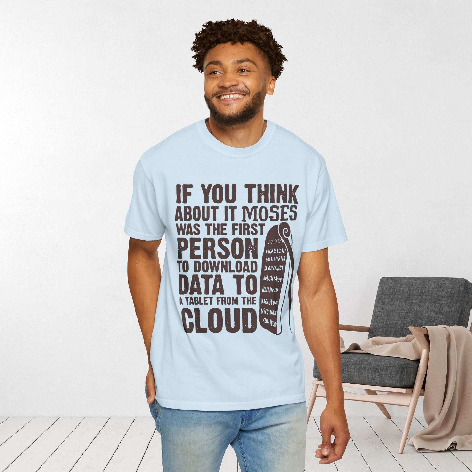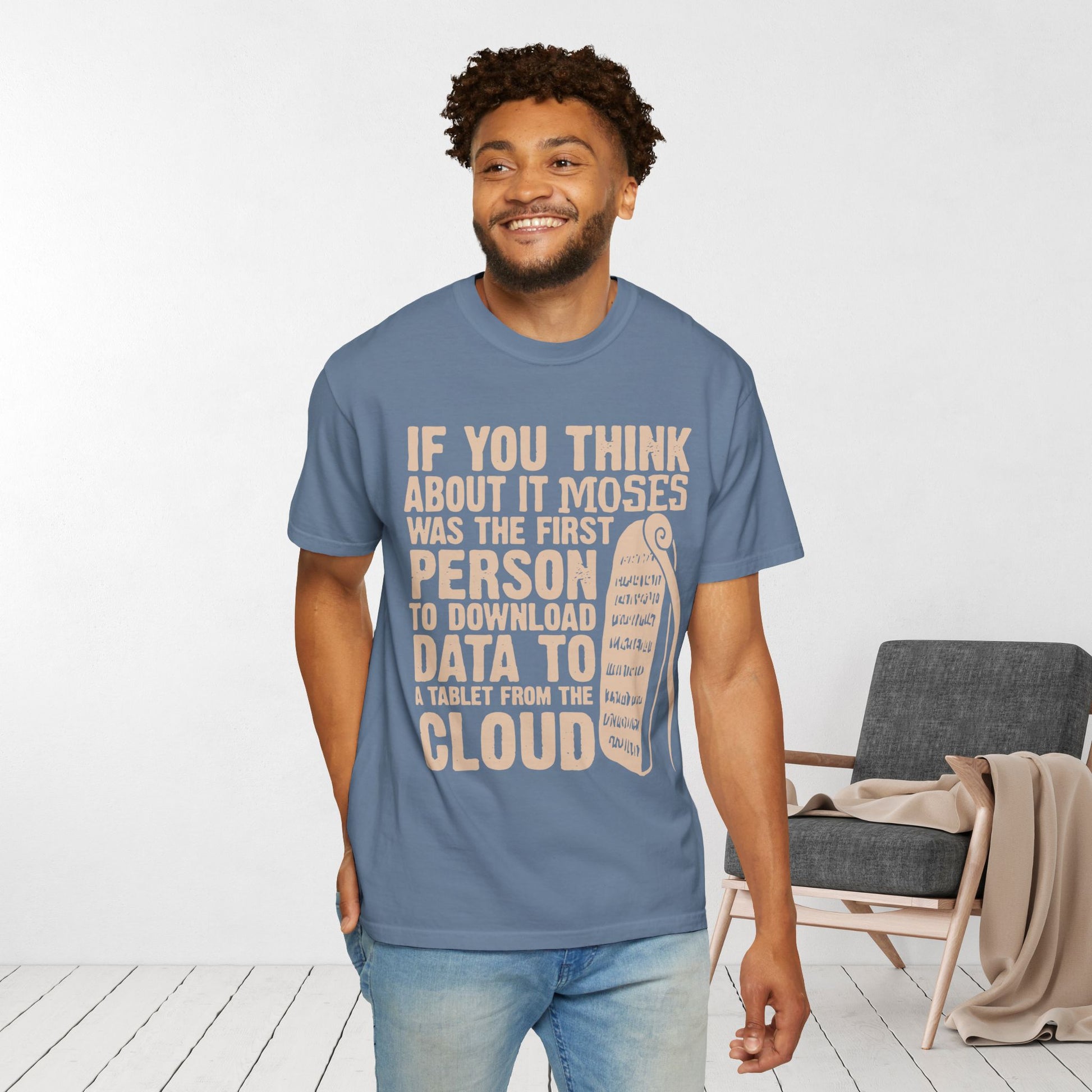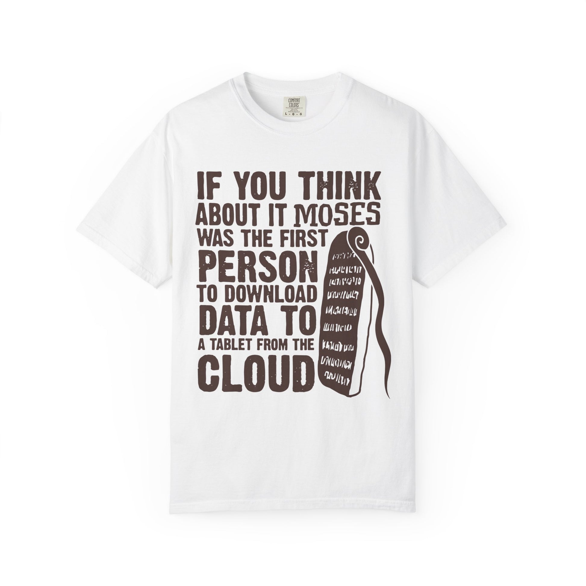 Part of the Bloom in Faith Collection — Celebrate the timeless connection between faith and modern inspiration with this fun, faith-filled tee! Featuring the clever phrase, “If You Think About It Moses Was The First Person to Download data to a tablet from the cloud,” this shirt is perfect for anyone who loves a little biblical humor mixed with deep truth.