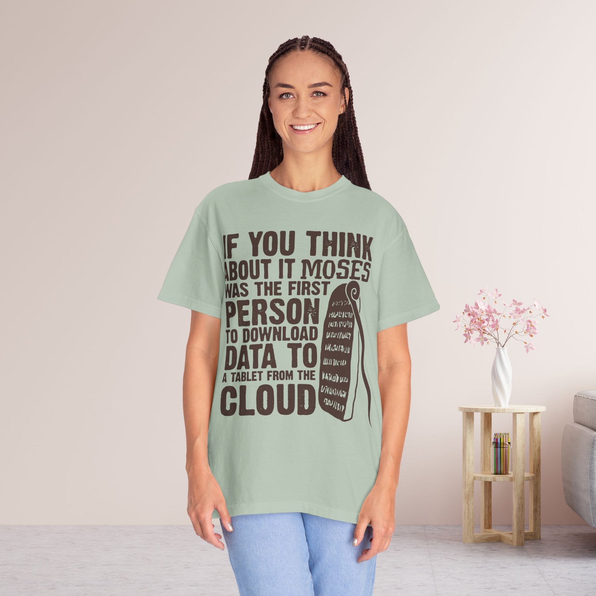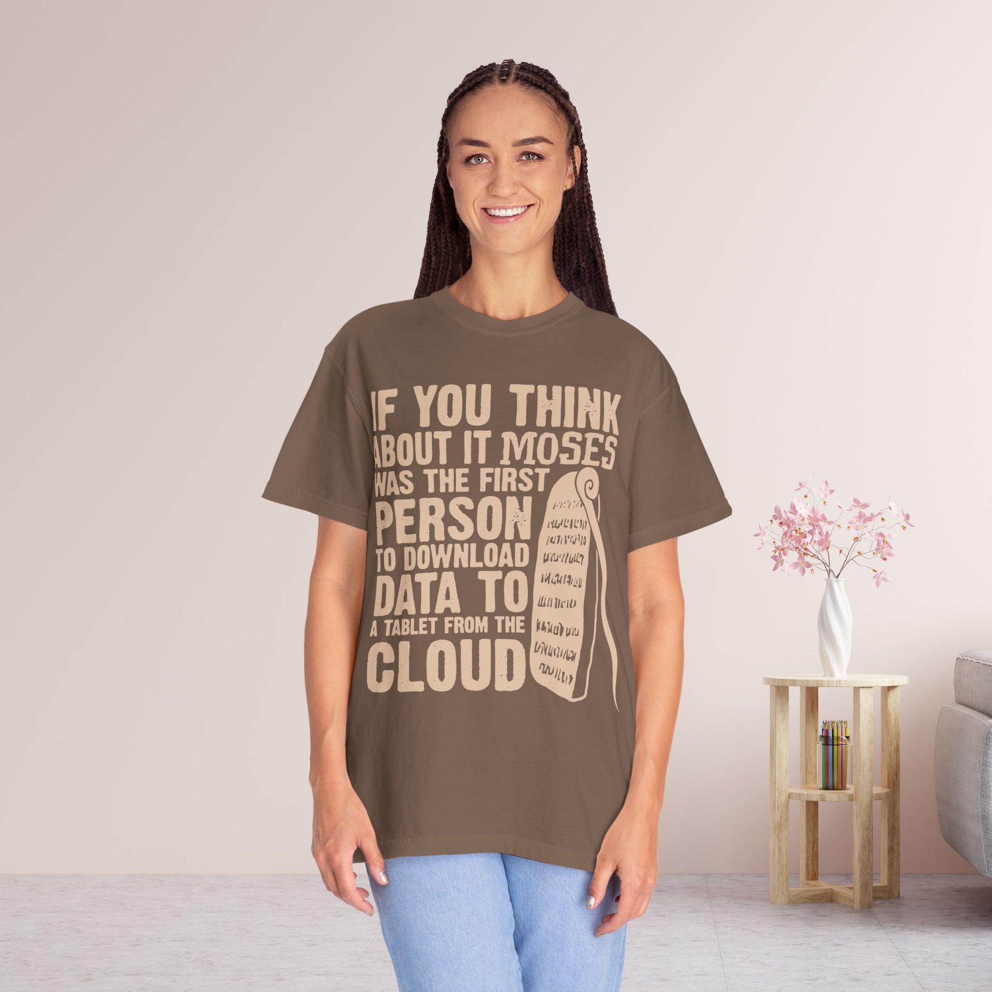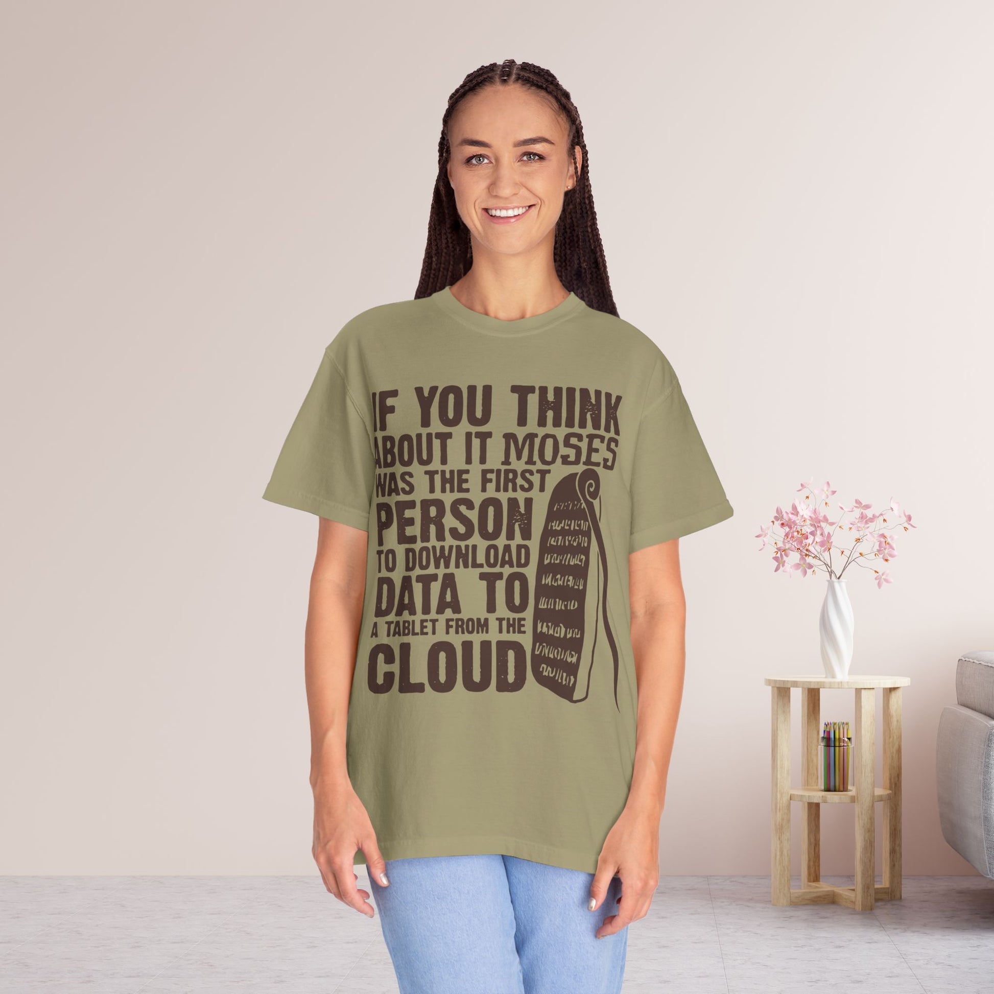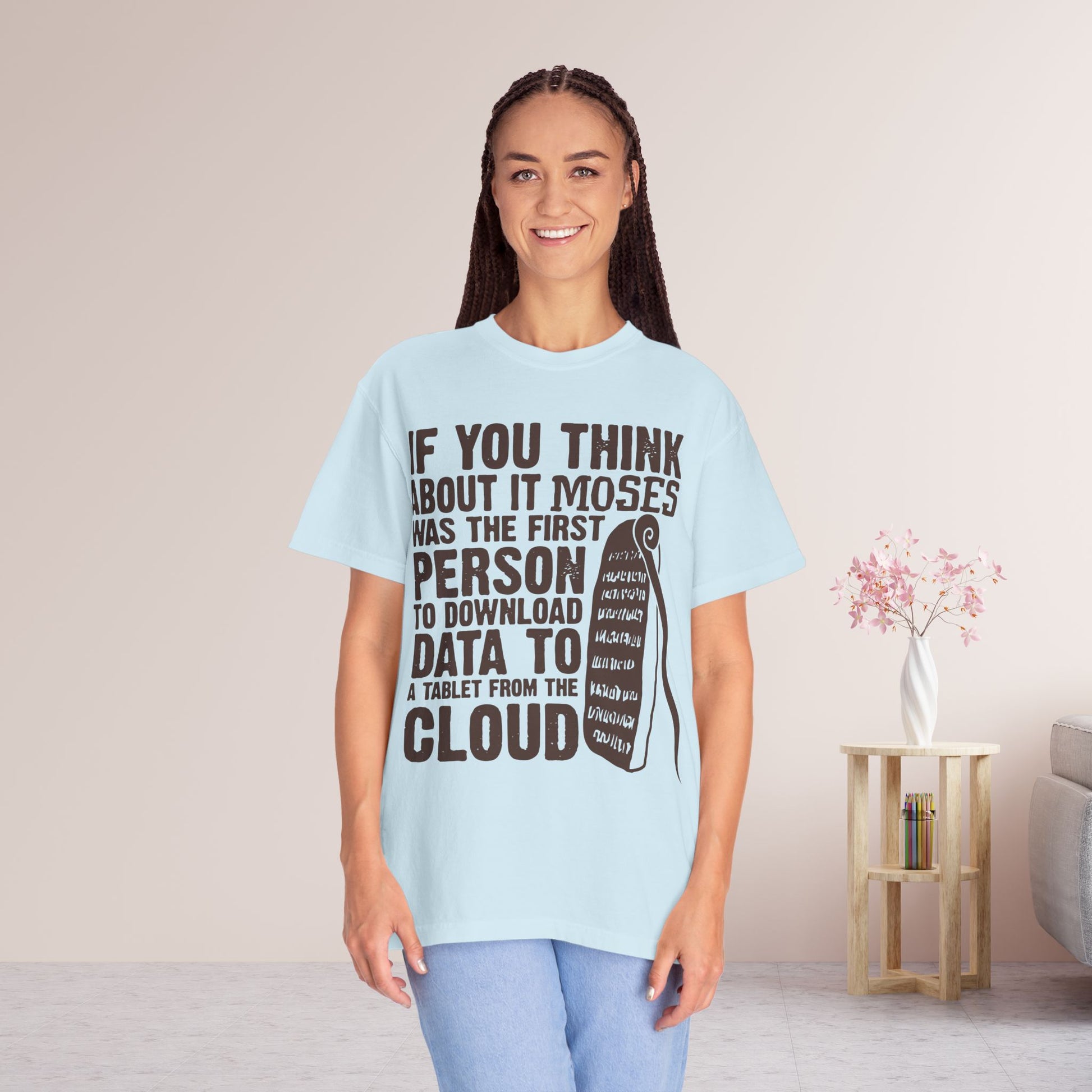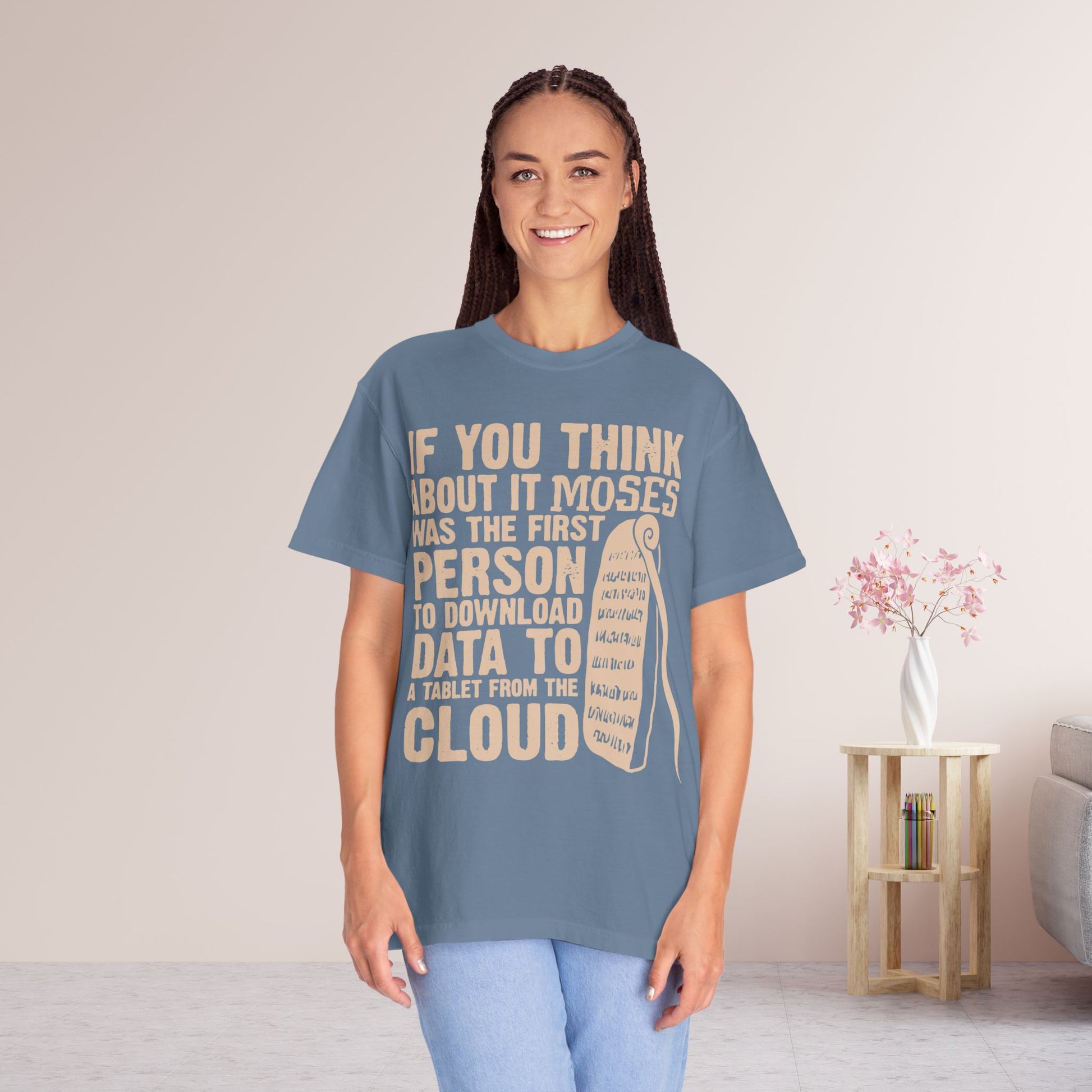 Part of the Bloom in Faith Collection — Celebrate the timeless connection between faith and modern inspiration with this fun, faith-filled tee! Featuring the clever phrase, “If You Think About It Moses Was The First Person to Download data to a tablet from the cloud,” this shirt is perfect for anyone who loves a little biblical humor mixed with deep truth.