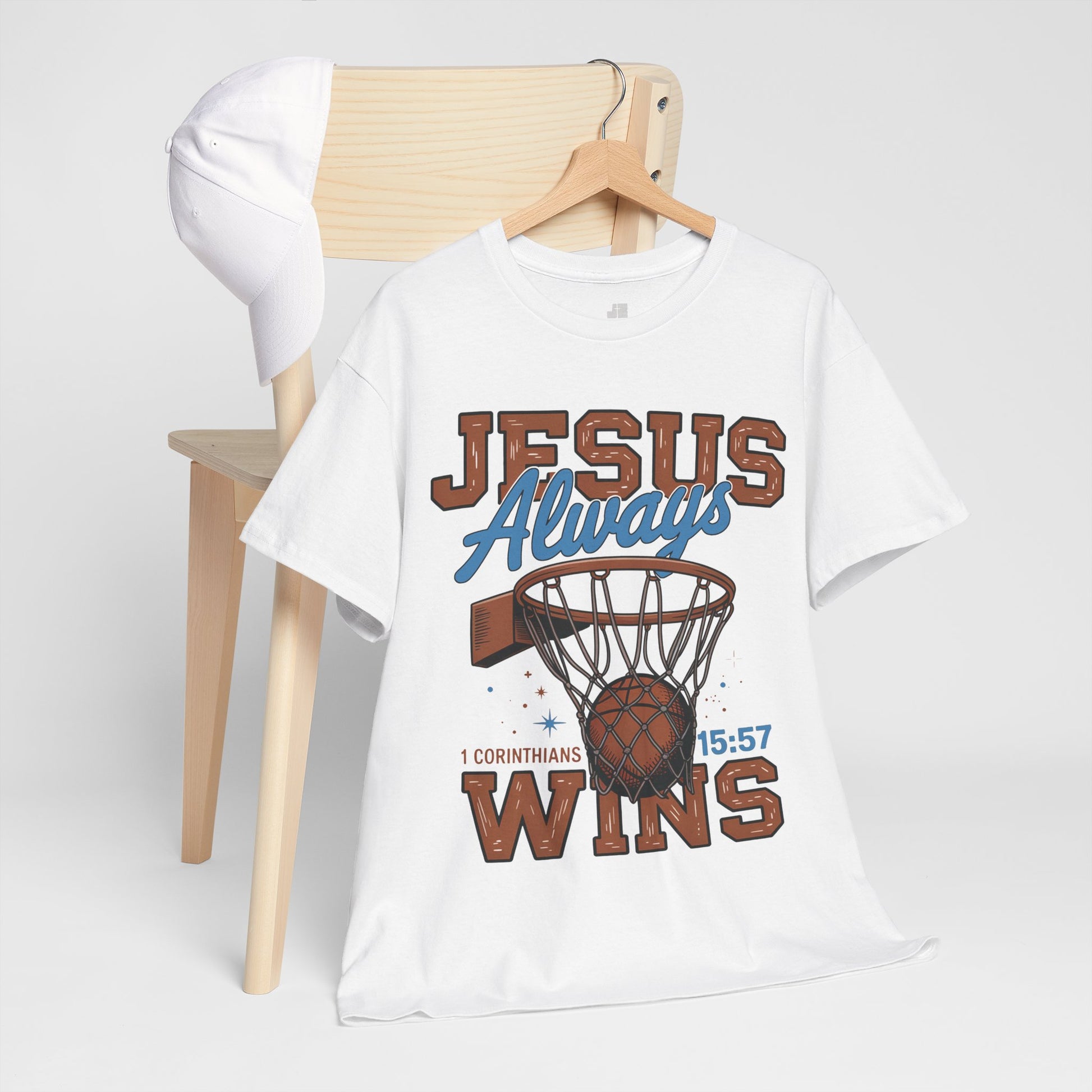 Declare the ultimate truth with our Jesus Always Wins Heavy Cotton T-Shirt, inspired by 1 Corinthians 15:57: