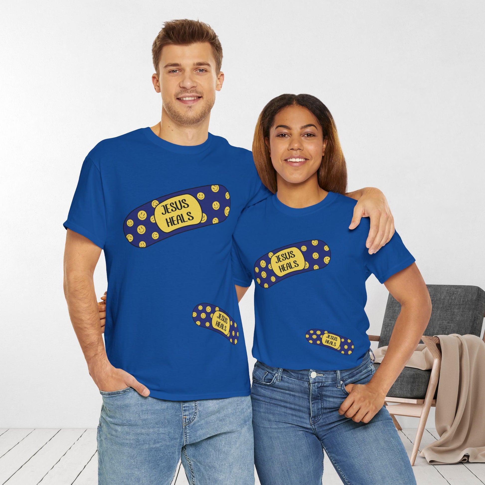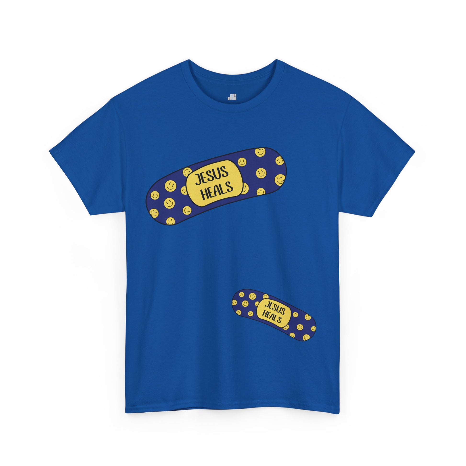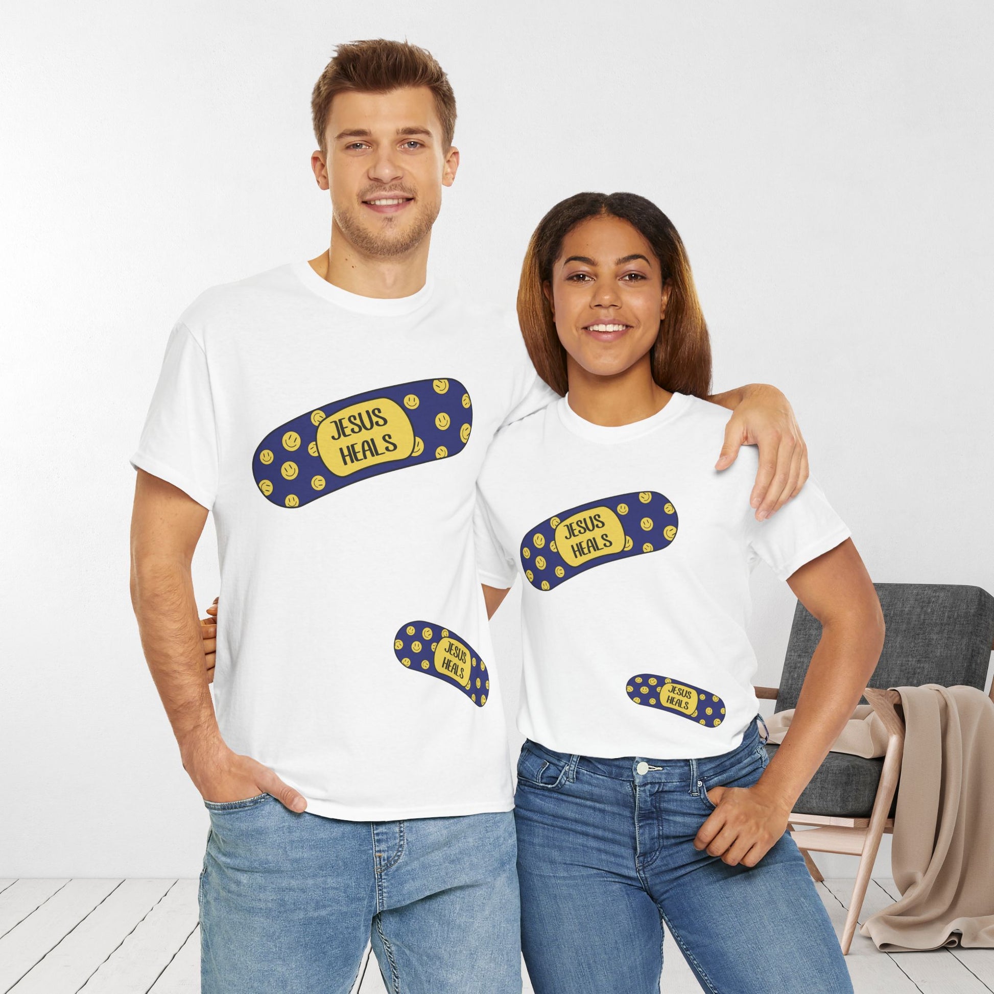 Featuring two bandage graphics on the front, each bandage carries the powerful message: “Jesus Heals.” This unique and creative design serves as a reminder that true healing comes from Jesus alone.
