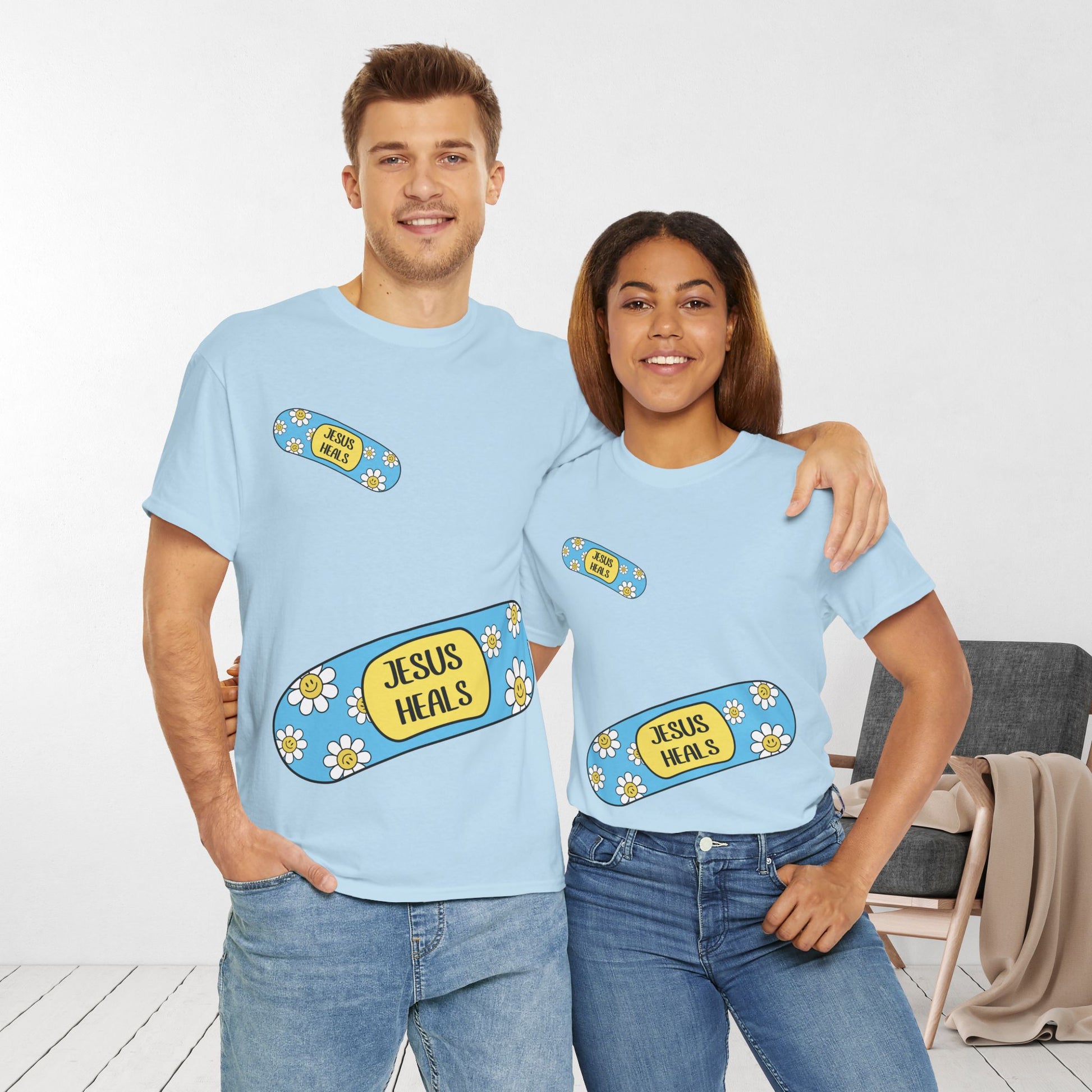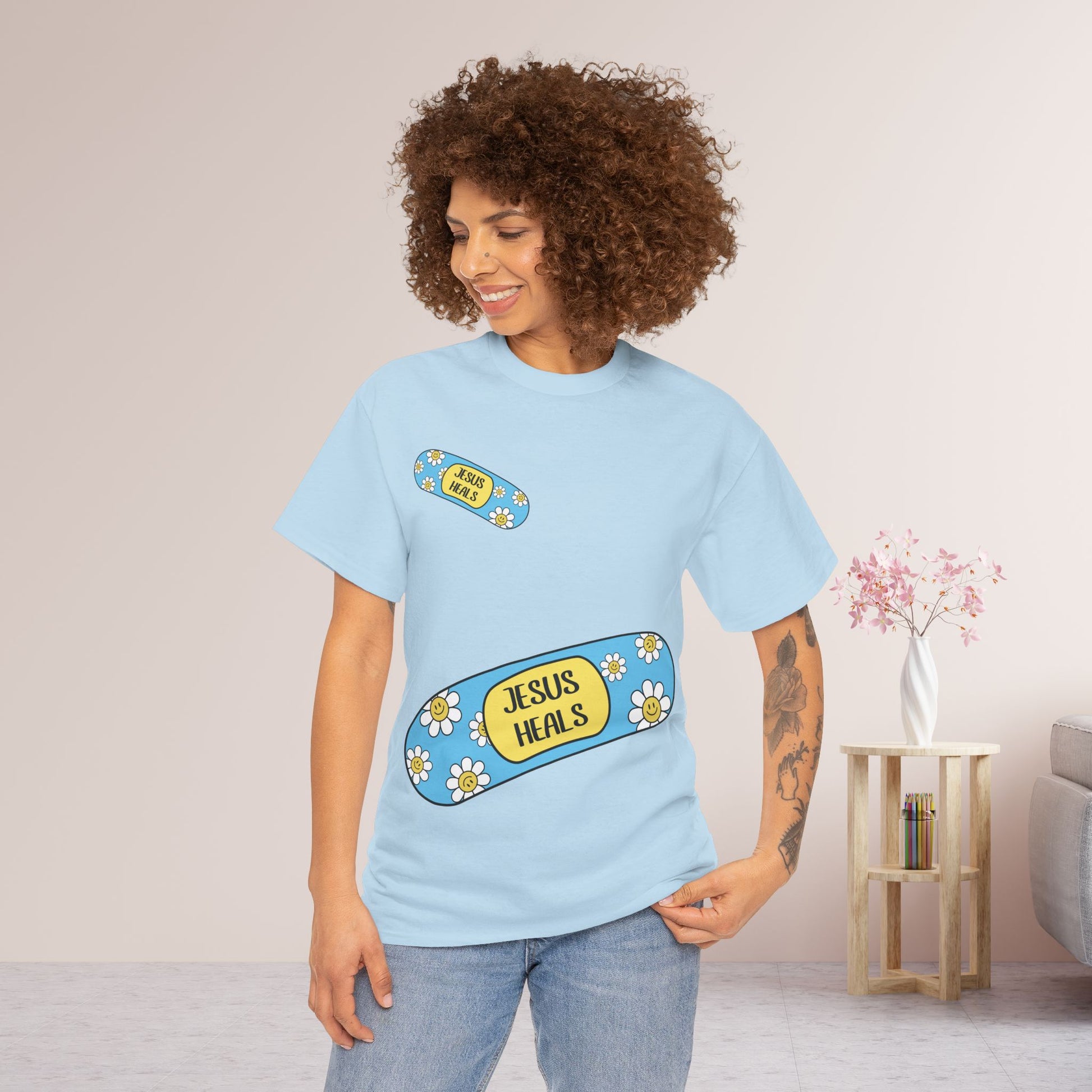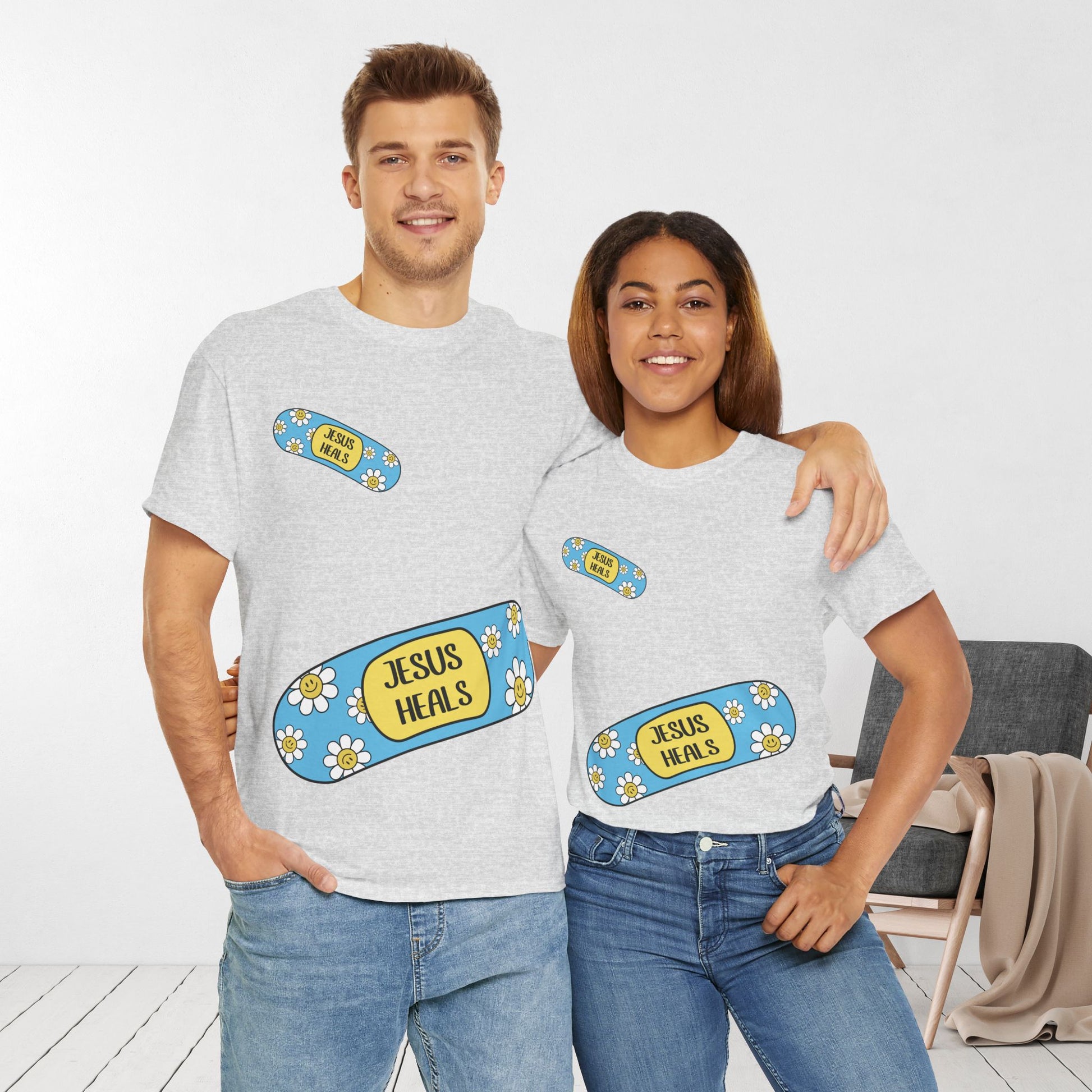 Featuring two bandage graphics on the front, each bandage carries the powerful message: “Jesus Heals.” This unique and creative design serves as a reminder that true healing comes from Jesus alone.
