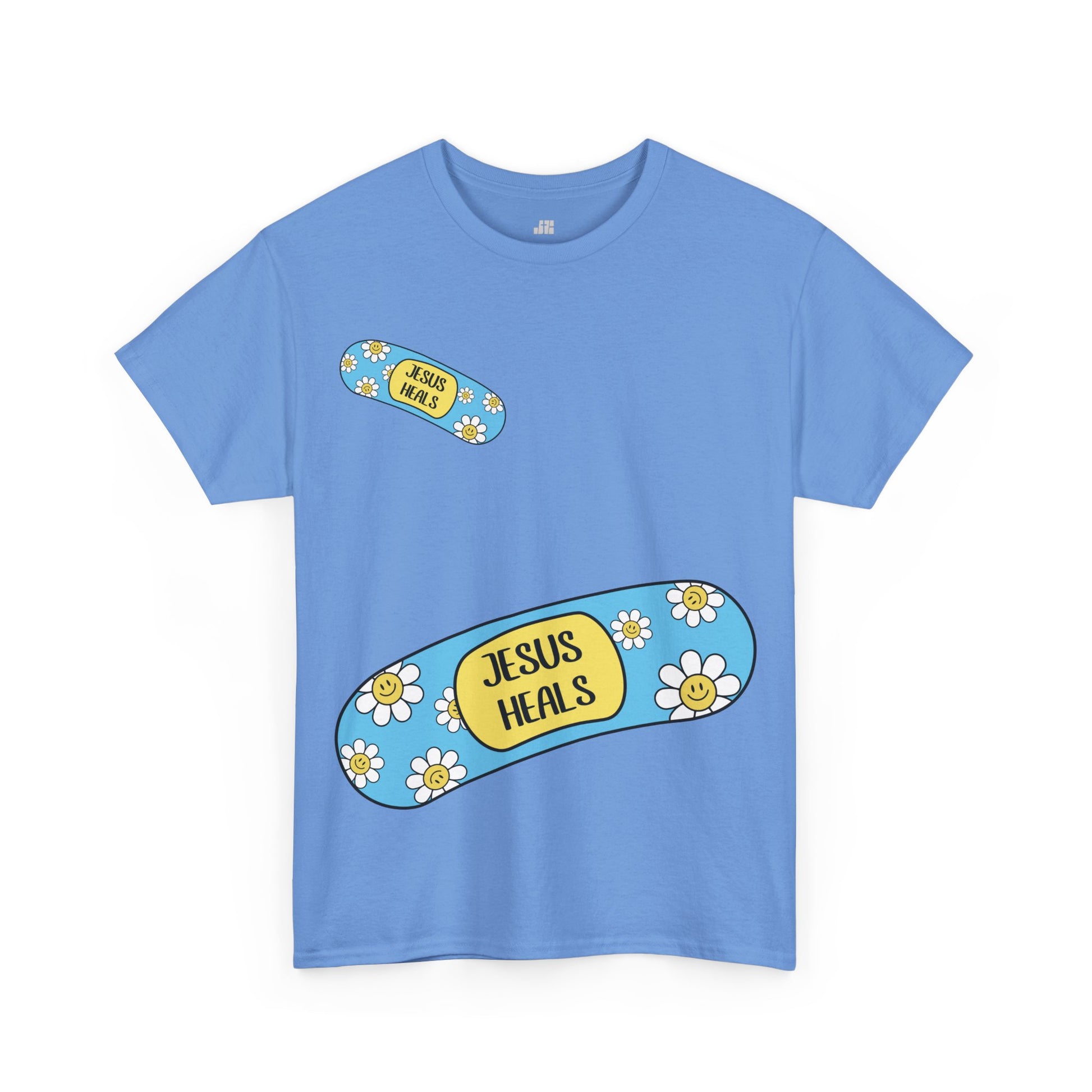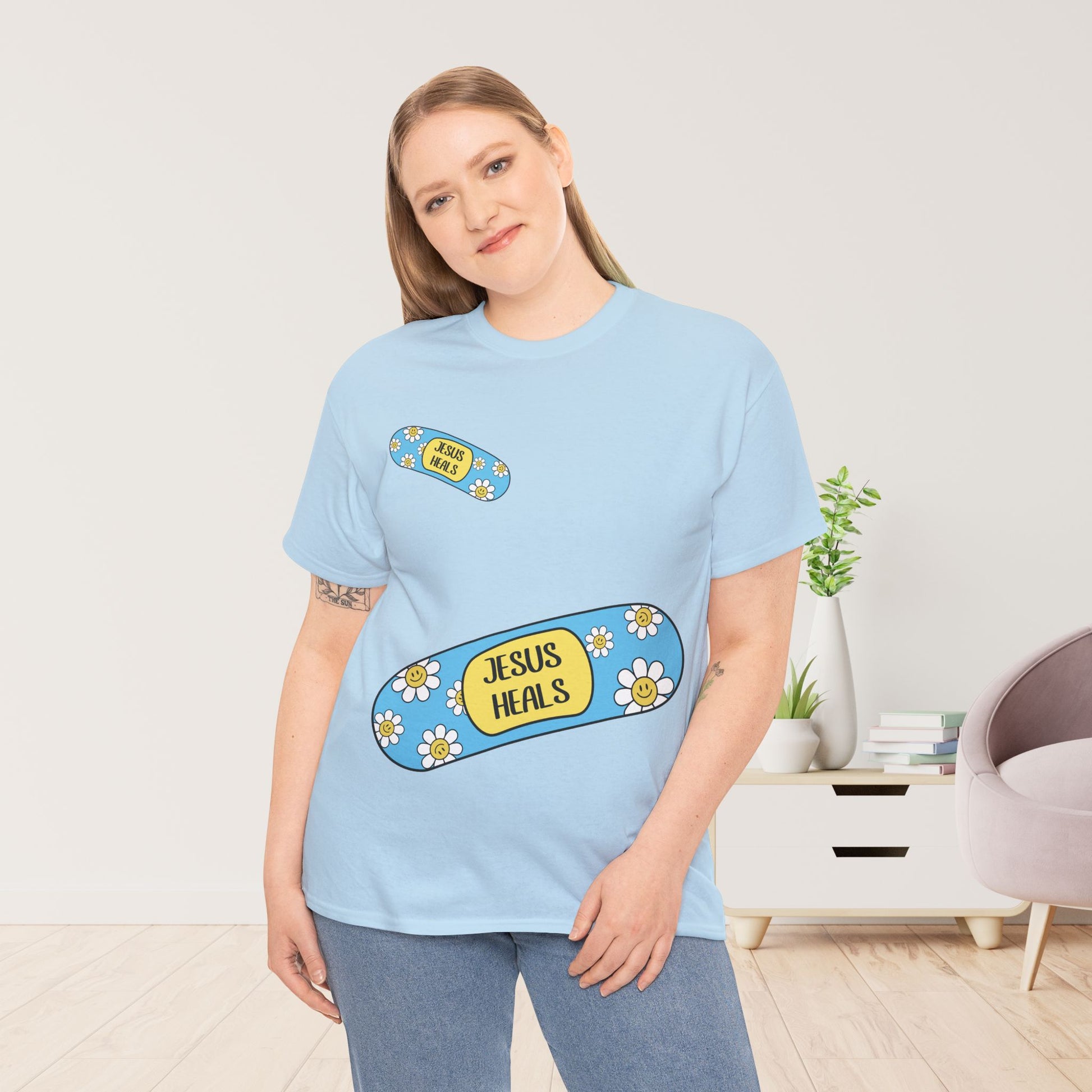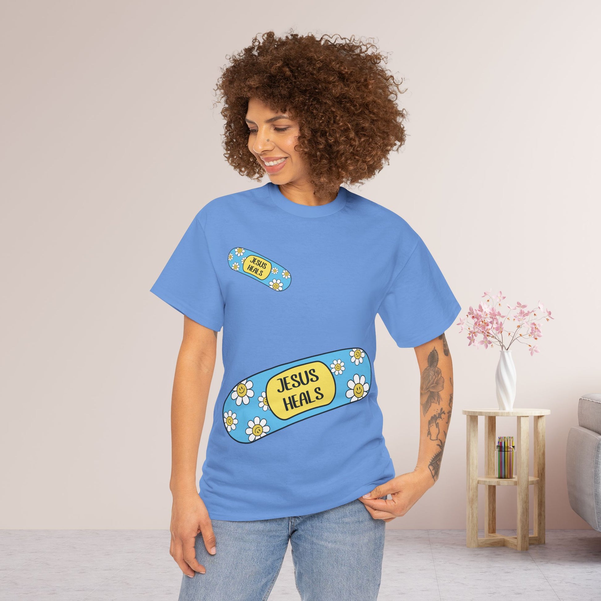 Featuring two bandage graphics on the front, each bandage carries the powerful message: “Jesus Heals.” This unique and creative design serves as a reminder that true healing comes from Jesus alone.