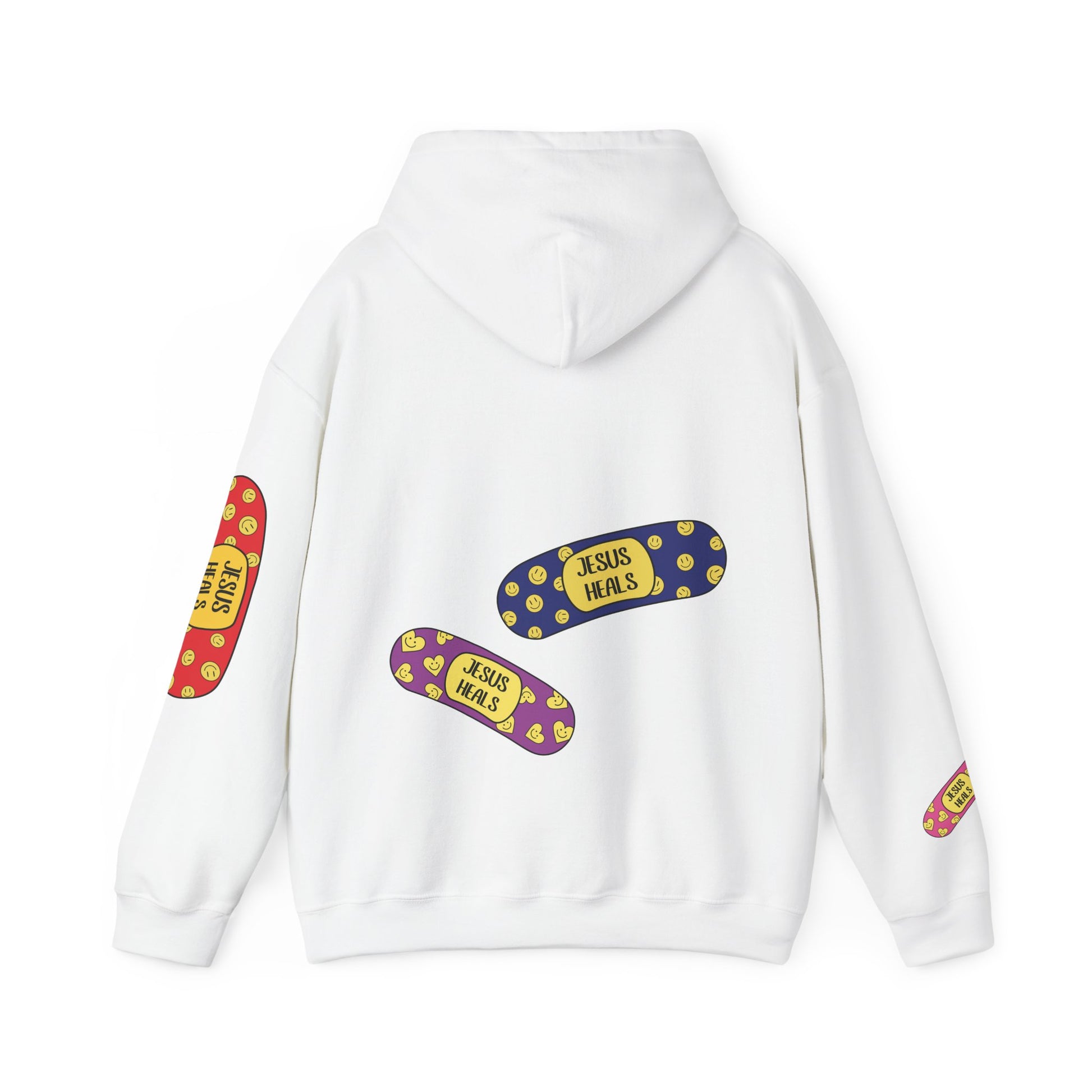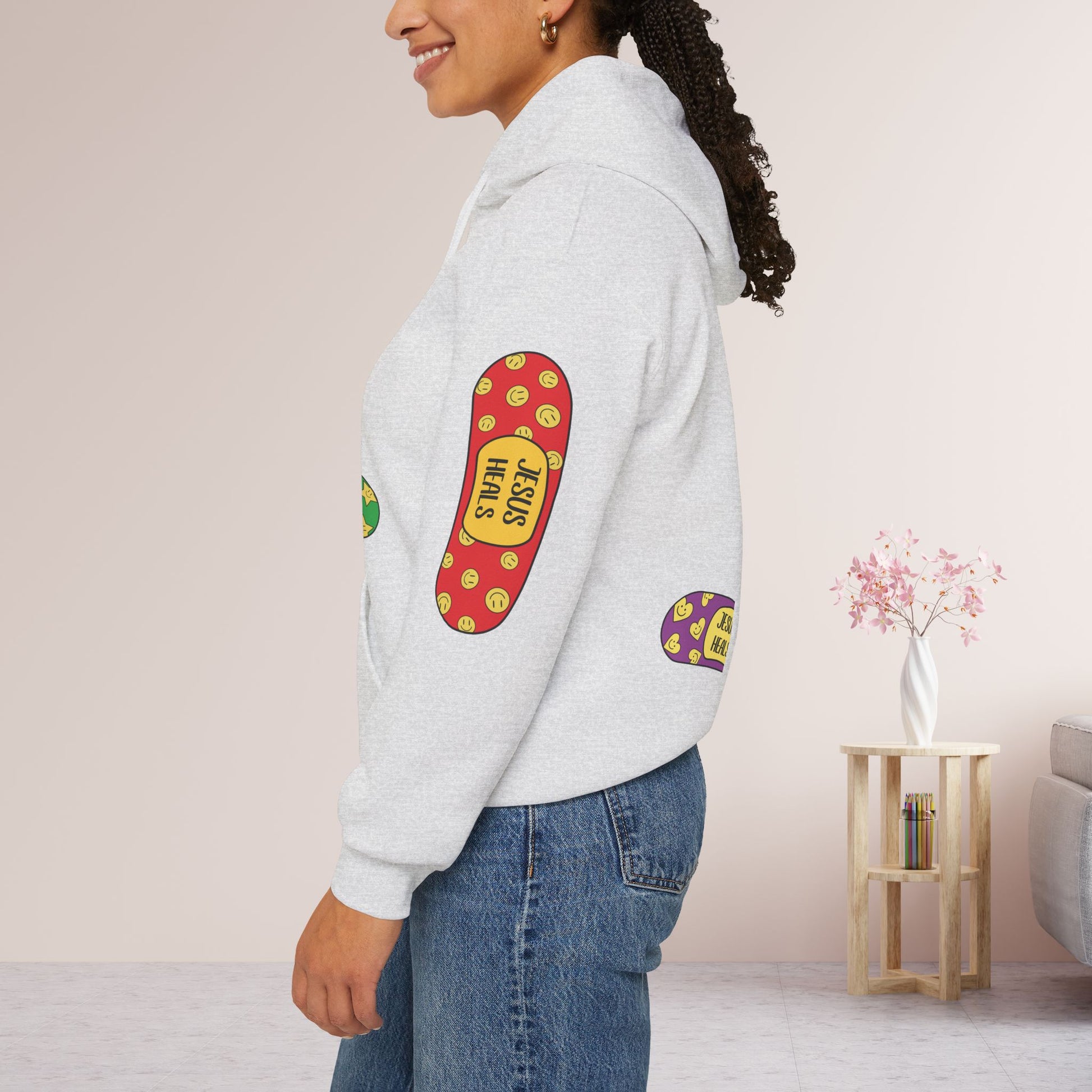 - Unique Bandage Design: Six eye-catching bandages printed across the hoodie, symbolizing healing and restoration through Jesus.