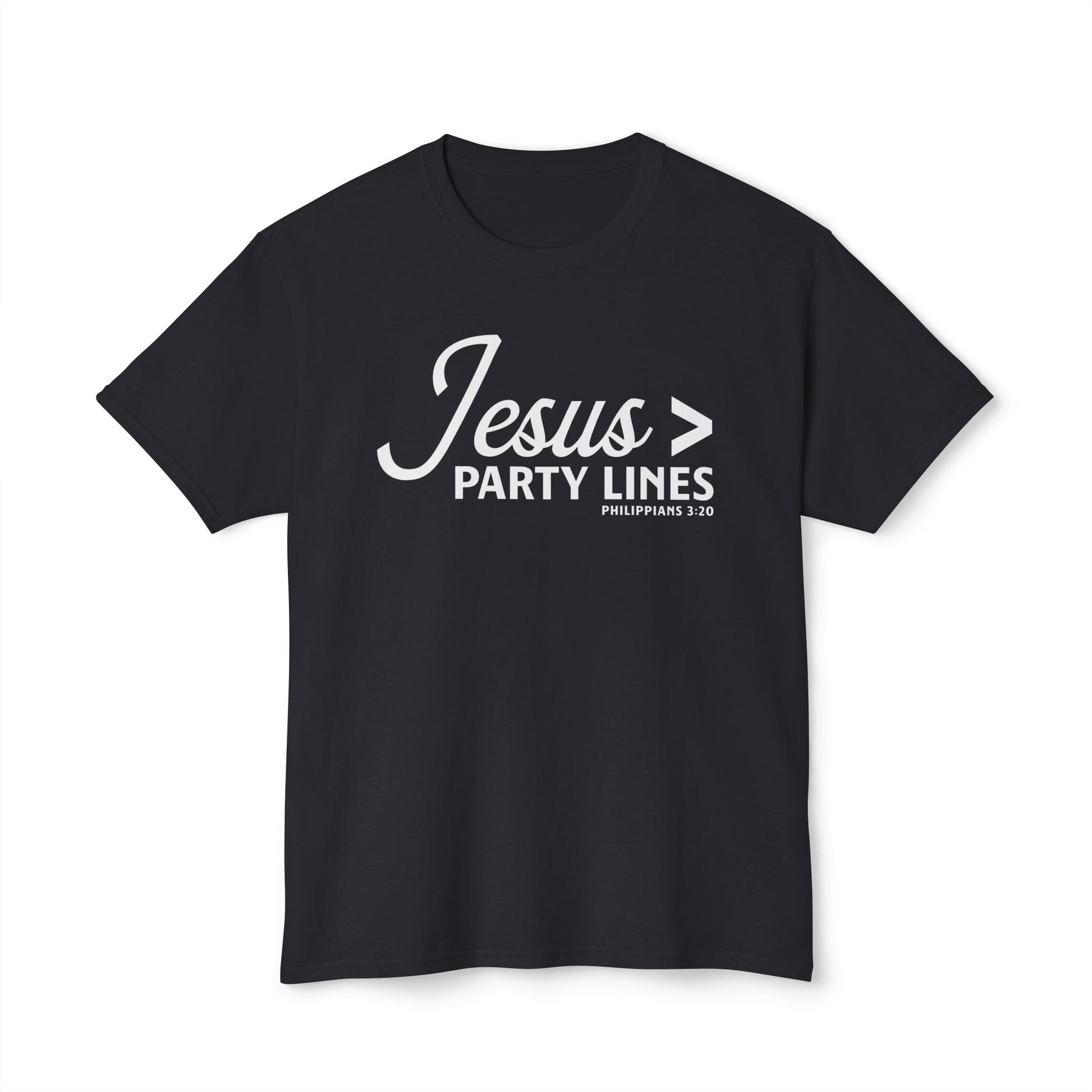 Make a bold faith statement with the “Jesus > Party Lines” Christian Tee, inspired by Philippians 3:20: “But our citizenship is in heaven. And we eagerly await a Savior from there, the Lord Jesus Christ.”