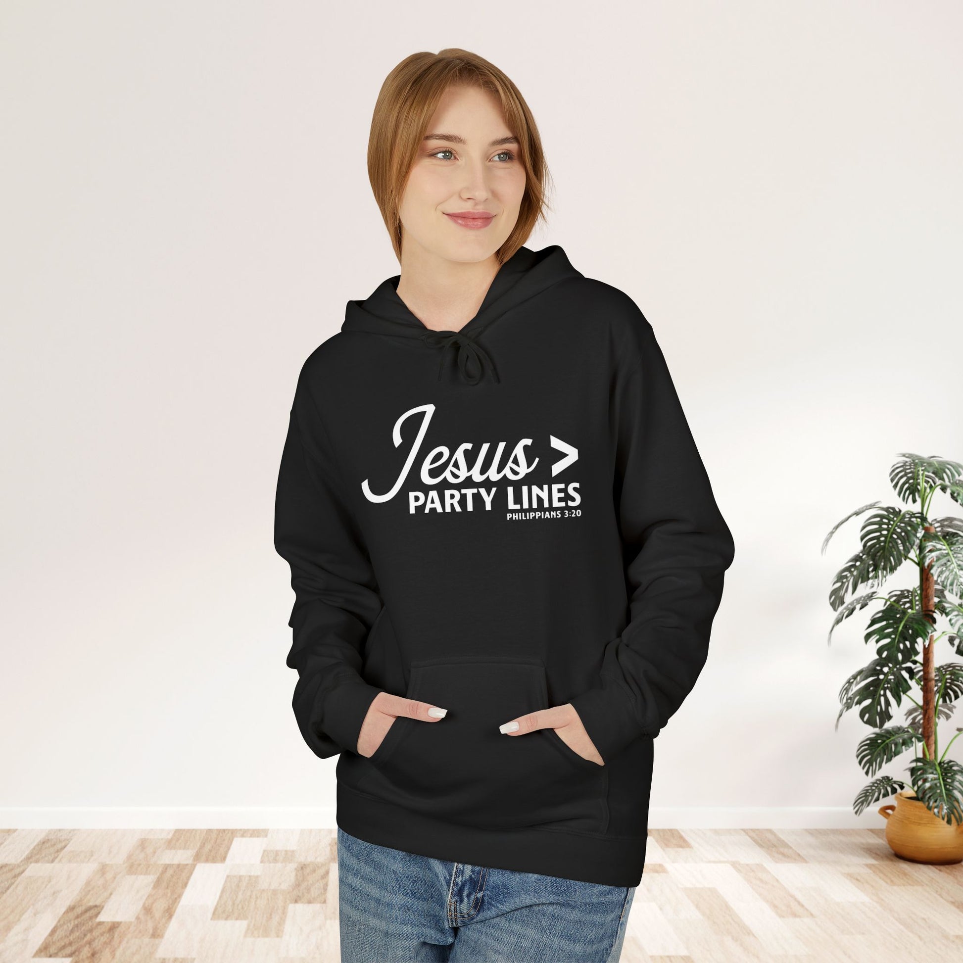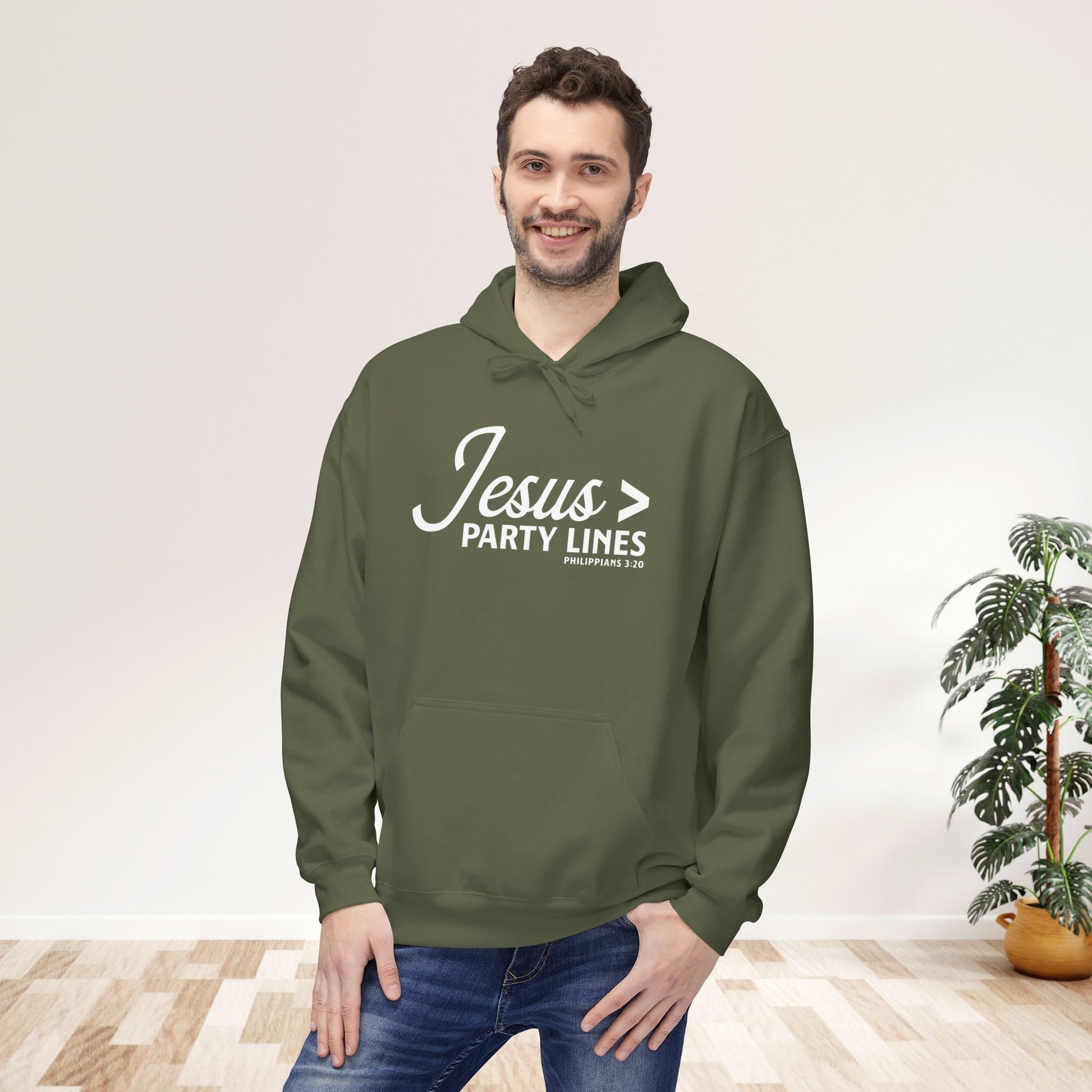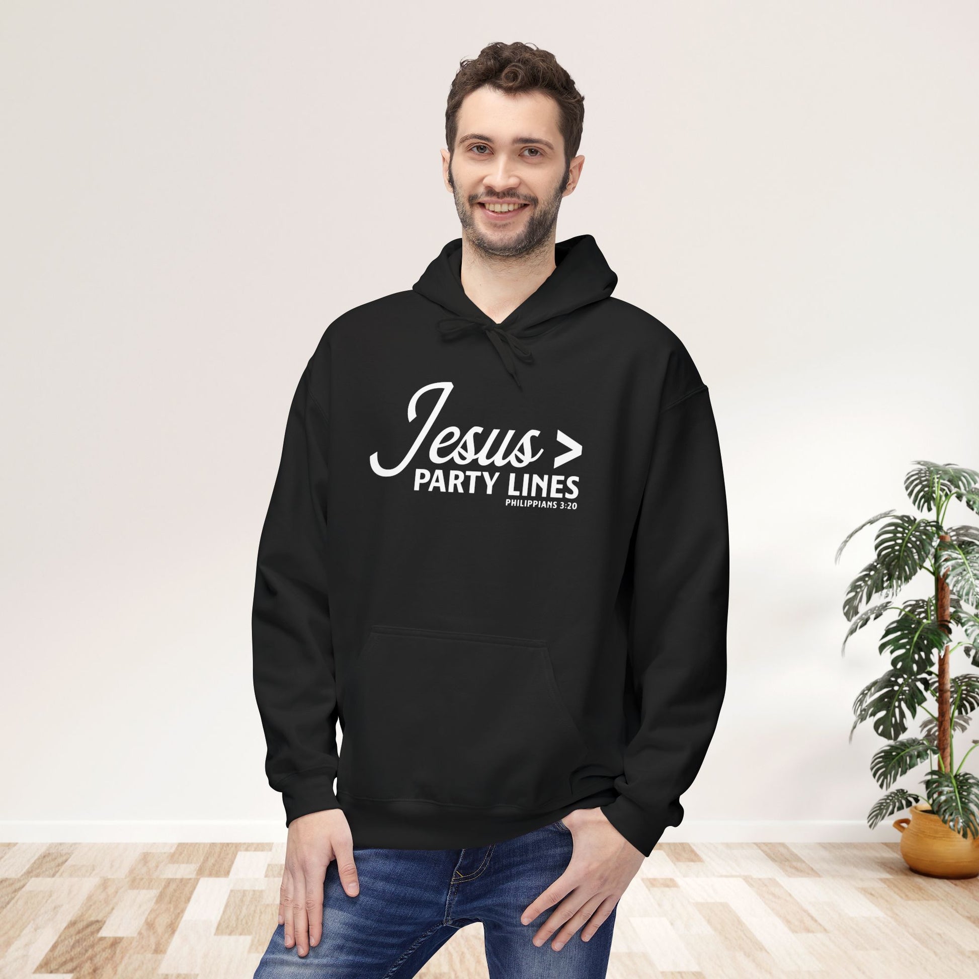 Make a bold faith statement with the “Jesus > Party Lines” Christian Hoodie, inspired by Philippians 3:20: “But our citizenship is in heaven. And we eagerly await a Savior from there, the Lord Jesus Christ.”