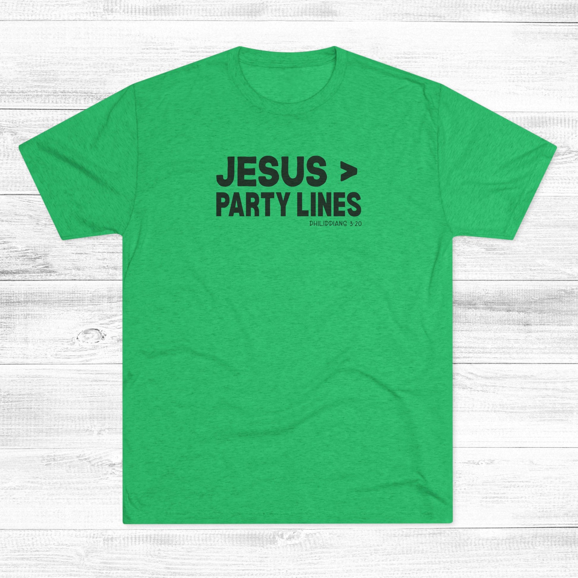 Make a bold faith statement with the “Jesus > Party Lines” Christian Tee, inspired by Philippians 3:20: “But our citizenship is in heaven. And we eagerly await a Savior from there, the Lord Jesus Christ.”
