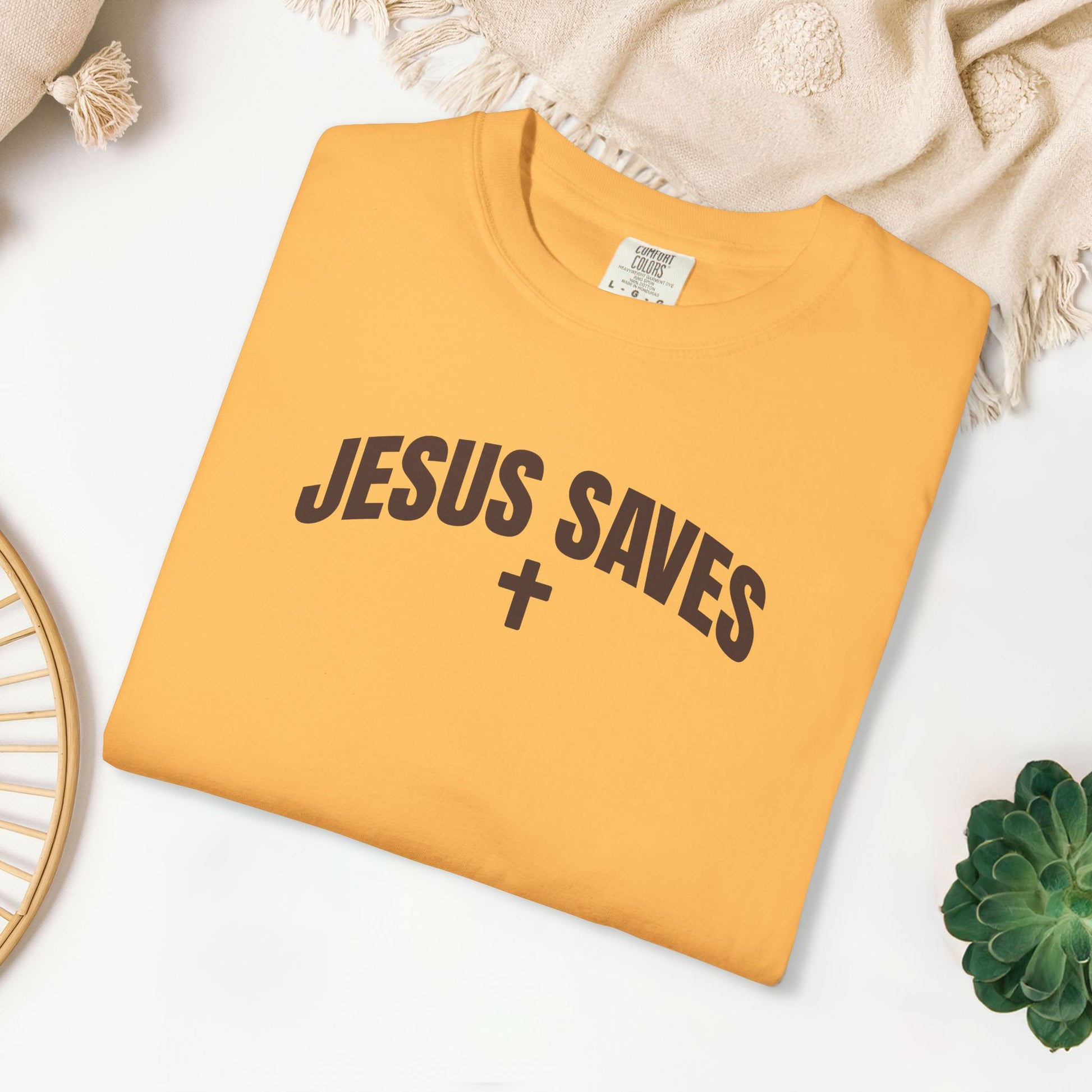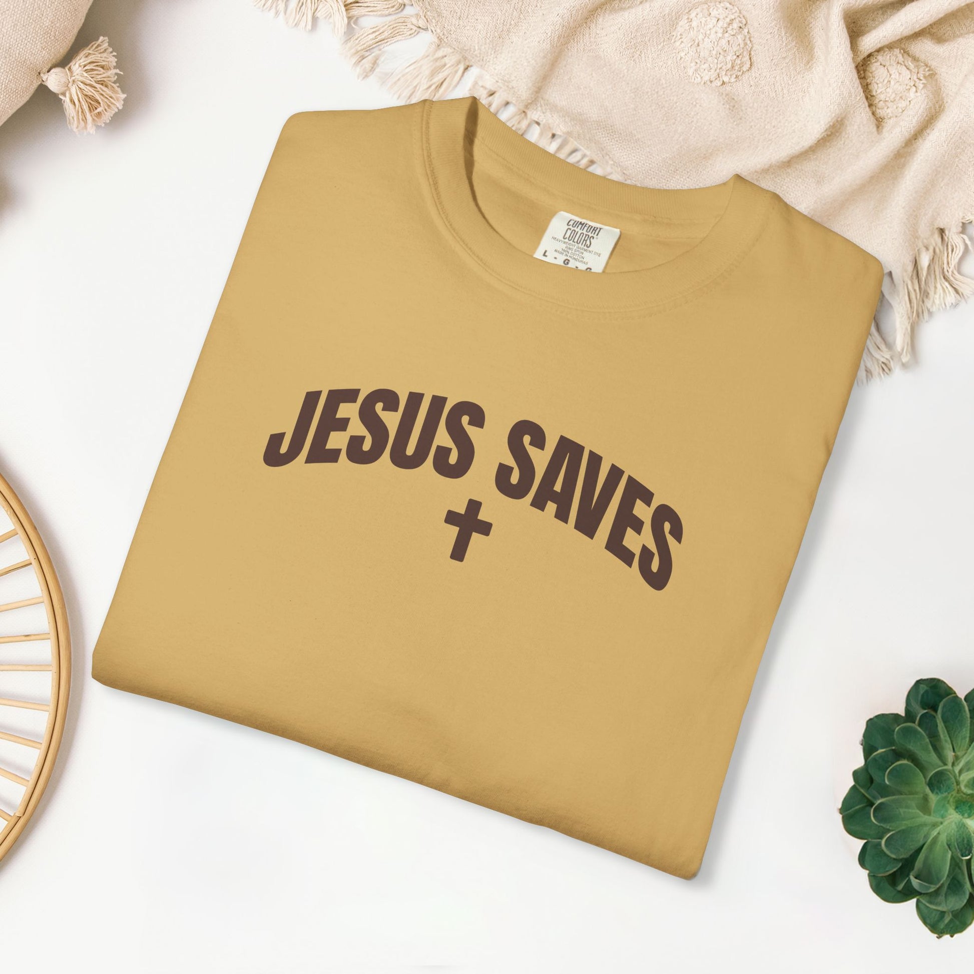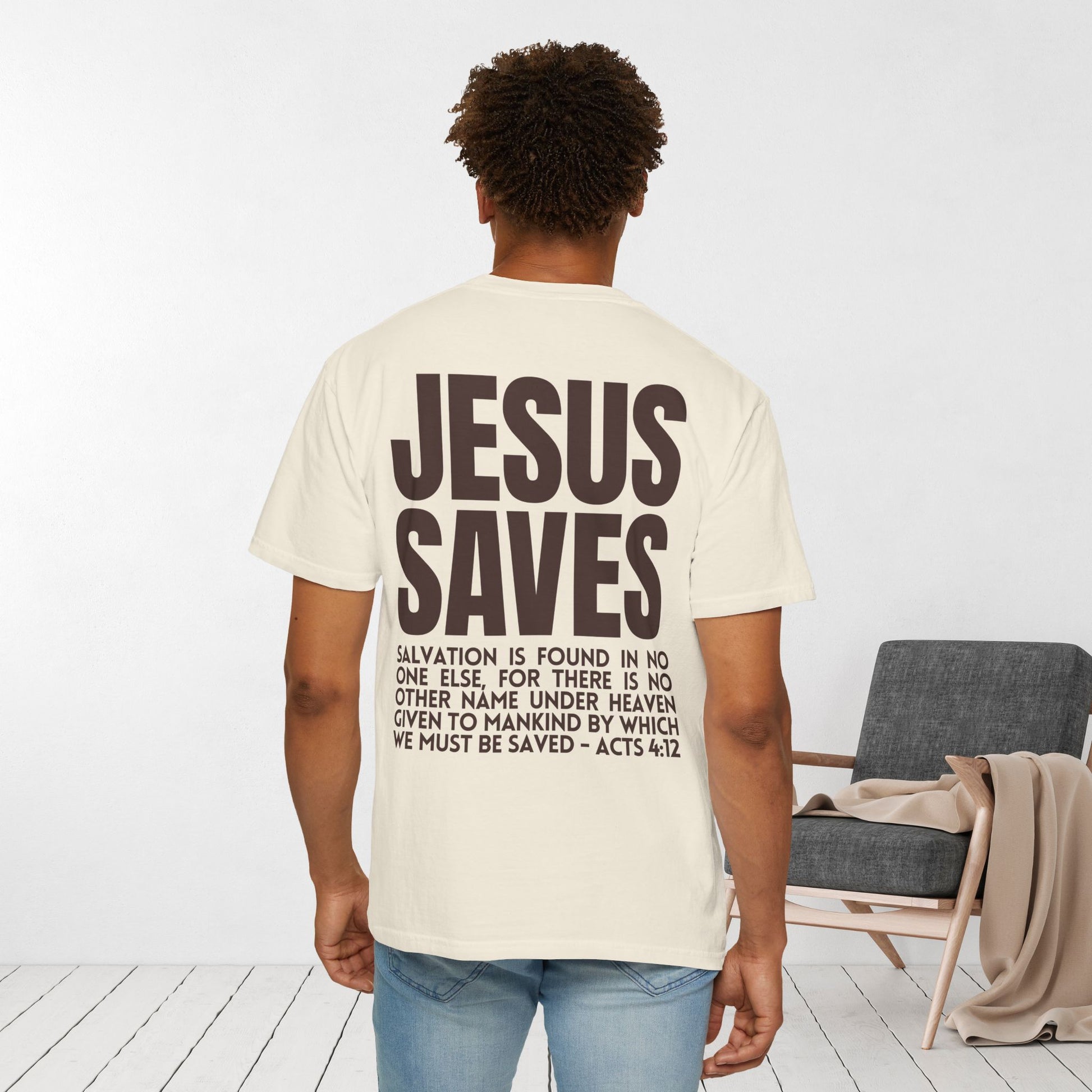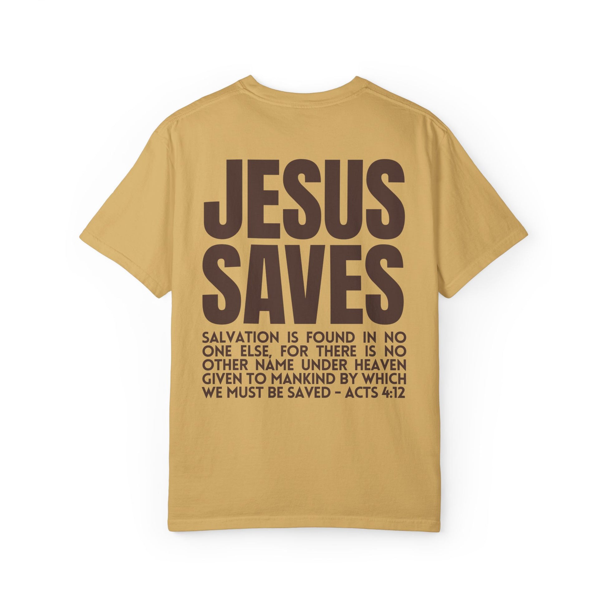 Carry the message of salvation wherever you go with our “Jesus Saves” Comfort Colors Tee, inspired by Acts 4:12: “Salvation is found in no one else, for there is no other name under heaven given to mankind by which we must be saved.”