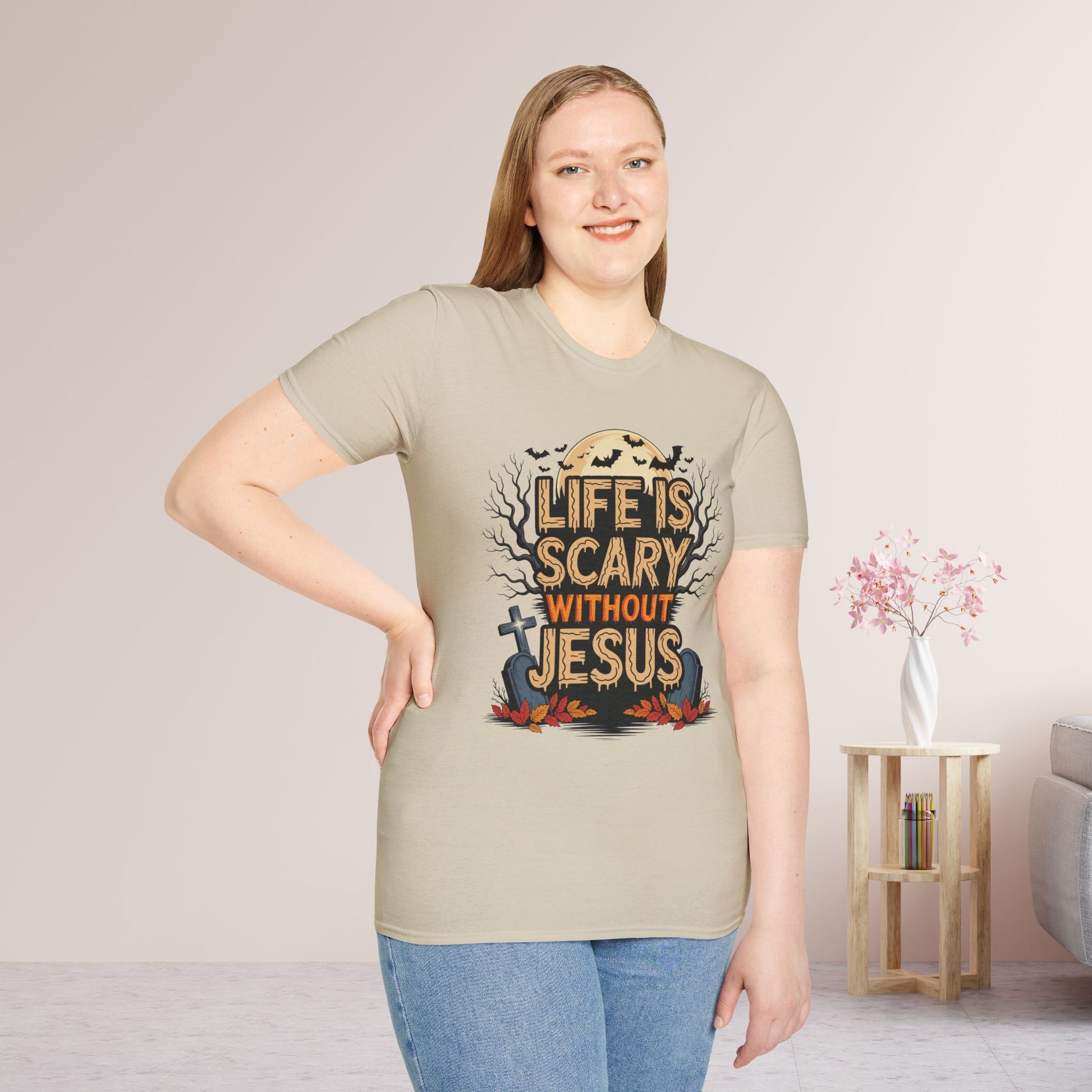 The Life is Scary Without Jesus Softstyle Tee is more than just a shirt—it’s a bold declaration of faith and a comforting reminder of the One who casts out fear.