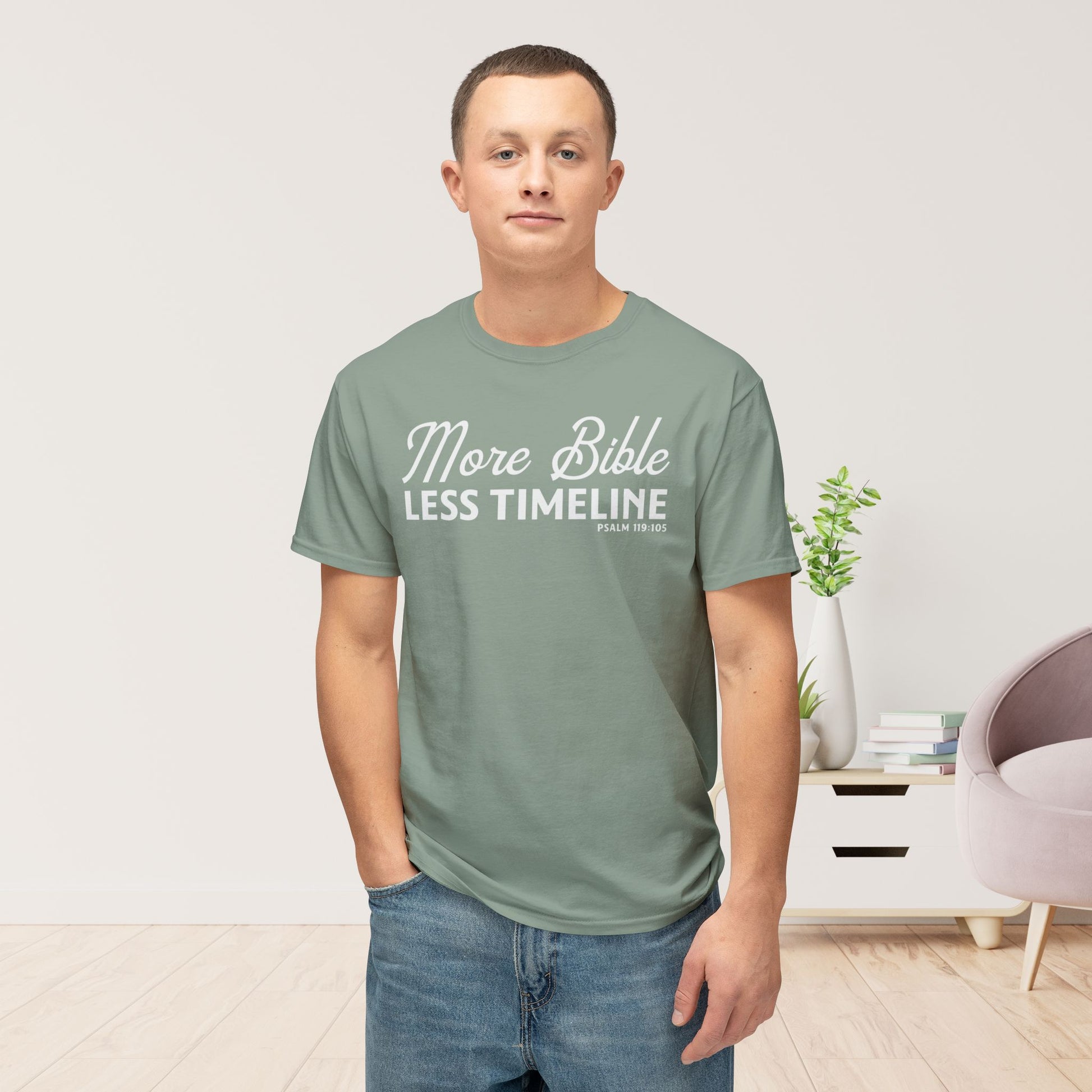 Fill your day with truth that outshines the noise of social media with our “More Bible, Less Timeline” Christian T-Shirt. Inspired by Psalm 119:105 — “Your word is a lamp to my feet and a light to my path” — this shirt is a reminder to root your attention in God’s Word, not endless scrolling.