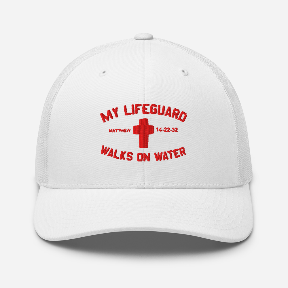 Show your faith and your style wherever you go with the My Lifeguard Walks on Water Snapback Trucker Cap.