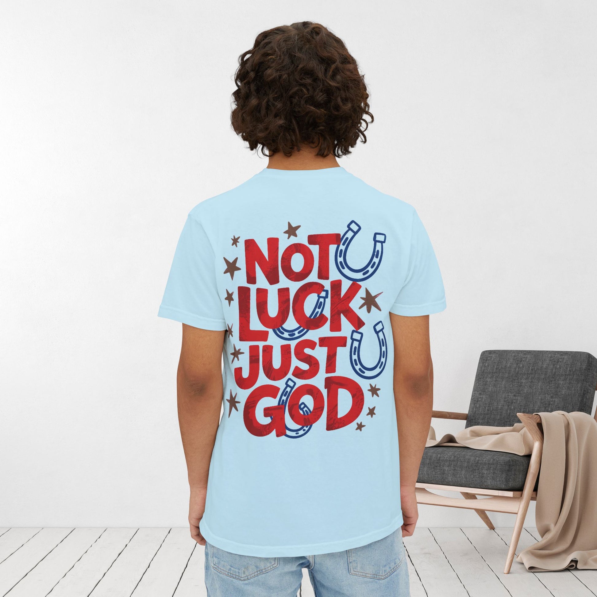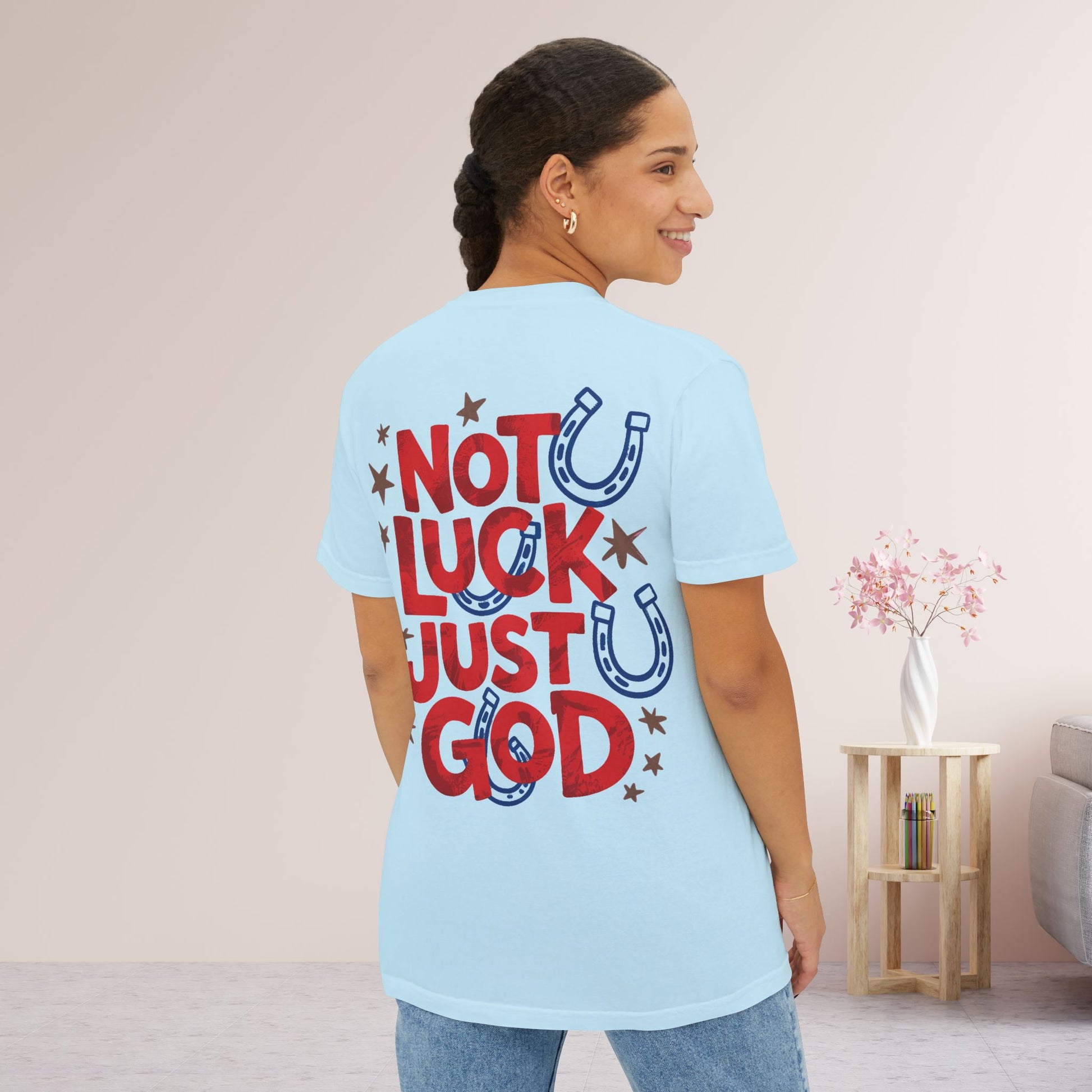 Simple, timeless, and full of truth—this Comfort Colors Pocket Tee carries the powerful message: Not Luck Just God.