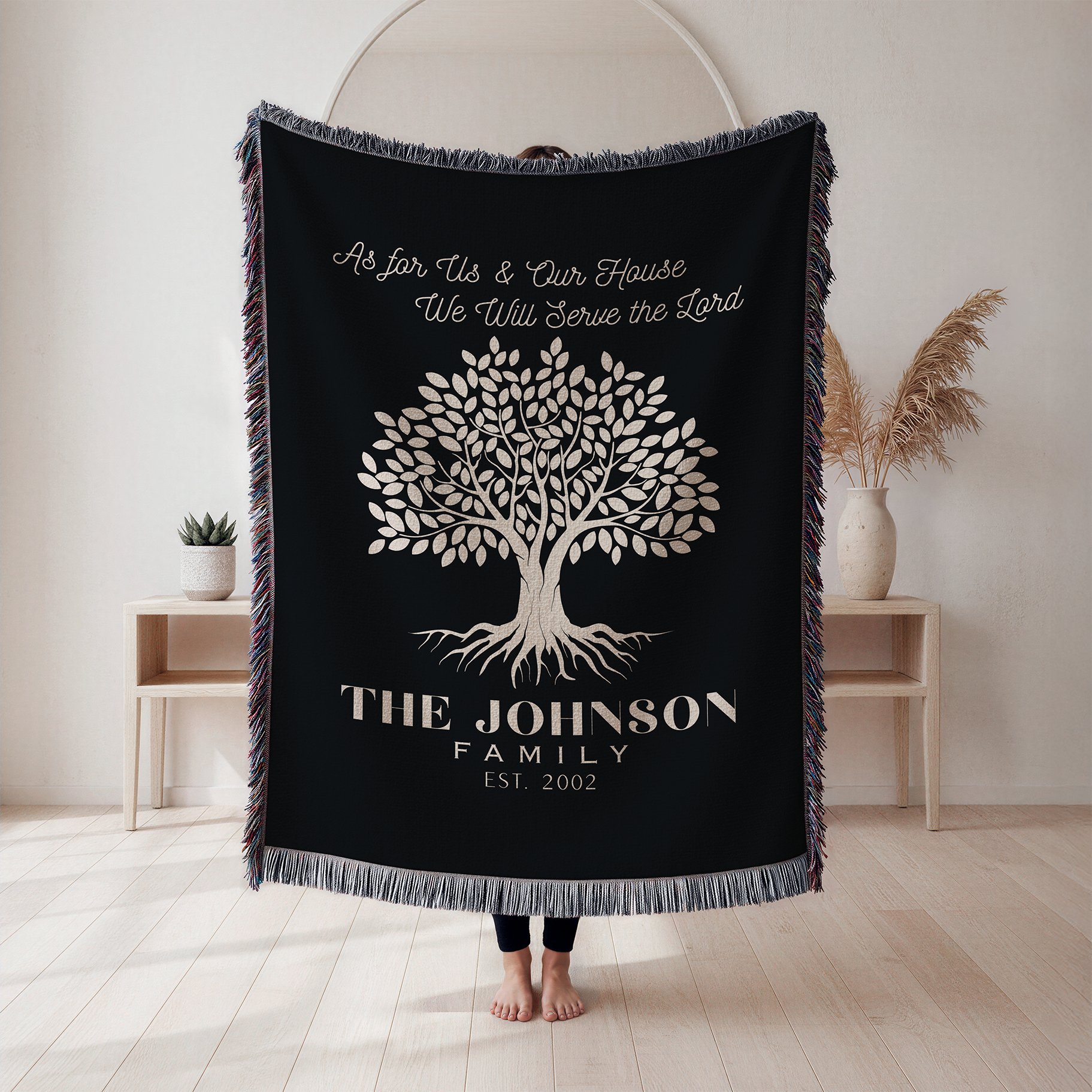 Make a meaningful declaration of faith in your home with our “As for Us & Our House, We Will Serve the Lord” Woven Blanket, inspired by Joshua 24:15. Designed for Christian families, this beautiful woven blanket features a symbolic family tree design and is personalized with your family name and established year, creating a timeless keepsake rooted in faith, love, and togetherness.